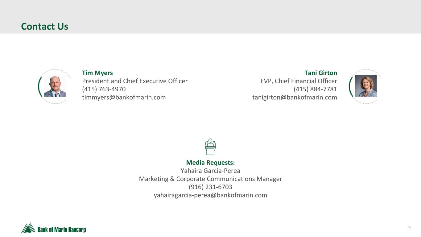 36 Text 95,96,96 Light Gray 232, 232, 232 Black 0, 0, 0 White 255, 255, 255 Accent 1 7,89,52 Accent 2 248,153,40 Accent 3 254,217,129 Accent 4 52,153,70 Accent 5 5,39,67 Accent 6 171,184,195 Contact Us Tim Myers President and Chief Executive Officer (415) 763-4970 timmyers@bankofmarin.com Tani Girton EVP, Chief Financial Officer (415) 884-7781 tanigirton@bankofmarin.com Media Requests: Yahaira Garcia-Perea Marketing & Corporate Communications Manager (916) 231-6703 yahairagarcia-perea@bankofmarin.com