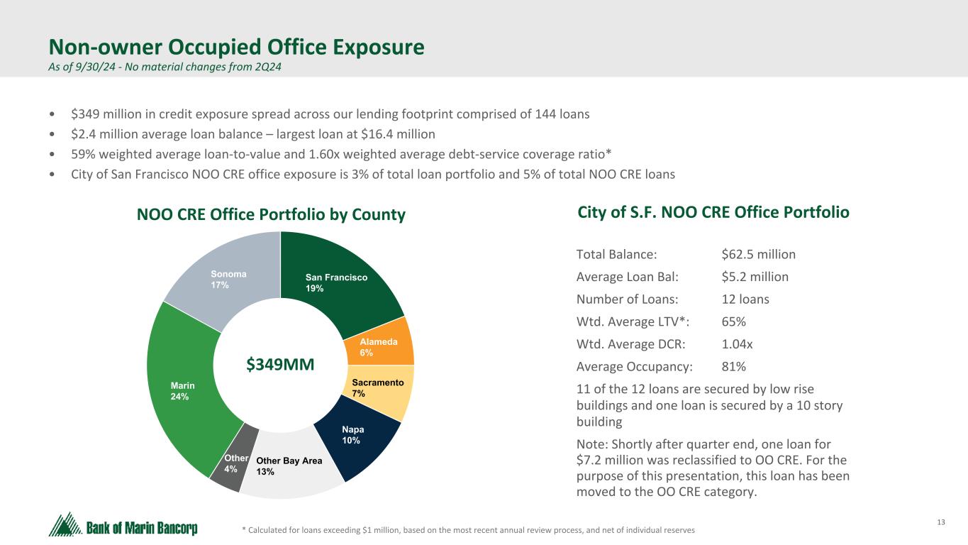 12 Text 95,96,96 Light Gray 232, 232, 232 Black 0, 0, 0 White 255, 255, 255 Accent 1 7,89,52 Accent 2 248,153,40 Accent 3 254,217,129 Accent 4 52,153,70 Accent 5 5,39,67 Accent 6 171,184,195 * Calculated for loans exceeding $1 million, based on the most recent annual review process Note: Sacramento includes surrounding regional counties NOO CRE Portfolio Diversified Across Property Type & County As of 9/30/24 - No material changes from 2Q24 Average Balance: $1.8MM Largest Balance: $13.8MM Total # of Loans: 141 Wtd. Avg. LTV*: 58% Average Balance: $1.9MM Largest Balance: $14.6MM Total # of Loans: 73 Wtd. Avg. LTV*: 55% Average Balance: $1.7MM Largest Balance: $21.6MM Total # of Loans: 121 Wtd. Avg. LTV*: 63% San Francisco 3% Alameda 5% Sacramento 21% Napa 17% Other Bay Area 15% Other 9% Marin 16% Sonoma 14% San Francisco 11% Alameda 18% Sacramento 18% Napa 3% Other Bay Area 4% Other 6% Marin 11% Sonoma 29% San Francisco 32% Alameda 20%Sacramento 6% Napa 5% Other Bay Area 5% Other 9% Marin 11% Sonoma 12% Retail 3Q24 Warehouse & Industrial 3Q24 Multifamily 3Q24 $247MM $136MM $207MM