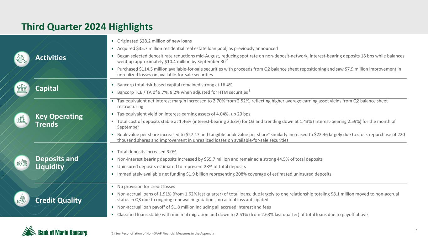 2 Text 95,96,96 Light Gray 232, 232, 232 Black 0, 0, 0 White 255, 255, 255 Accent 1 7,89,52 Accent 2 248,153,40 Accent 3 254,217,129 Accent 4 52,153,70 Accent 5 5,39,67 Accent 6 171,184,195 Forward-Looking Statements This discussion of financial results includes forward-looking statements within the meaning of Section 27A of the Securities Act of 1933, as amended, (the "1933 Act") and Section 21E of the Securities Exchange Act of 1934, as amended, (the "1934 Act"). Those sections of the 1933 Act and 1934 Act provide a "safe harbor" for forward-looking statements to encourage companies to provide prospective information about their financial performance so long as they provide meaningful, cautionary statements identifying important factors that could cause actual results to differ significantly from projected results. Our forward-looking statements include descriptions of plans or objectives of management for future operations, products or services, and forecasts of revenues, earnings or other measures of economic performance. Forward-looking statements can be identified by the fact that they do not relate strictly to historical or current facts. They often include the words "believe," "expect," "intend," "estimate" or words of similar meaning, or future or conditional verbs preceded by "will," "would," "should," "could" or "may." Forward-looking statements are based on management's current expectations regarding economic, legislative, and regulatory issues that may affect our earnings in future periods. Factors that could cause future results to vary materially from current management expectations include, but are not limited to, general economic conditions and the economic uncertainty in the United States and abroad, including economic or other disruptions to financial markets caused by acts of terrorism, war, impacts from inflation, supply chain disruptions, changes in interest rates (including the actions taken by the Federal Reserve to control inflation), California's unemployment rate, deposit flows, real estate values, and expected future cash flows on loans and securities; the impact of adverse developments at other banks, including bank failures, that impact general sentiment regarding the stability and liquidity of banks; costs or effects of acquisitions; competition; changes in accounting principles, policies or guidelines; changes in legislation or regulation; natural disasters (such as wildfires and earthquakes in our area); adverse weather conditions; interruptions of utility service in our markets for sustained periods; and other economic, competitive, governmental, regulatory and technological factors (including external fraud and cybersecurity threats) affecting our operations, pricing, products and services; and successful integration of acquisitions. These and other important factors detailed in various securities law filings made periodically by Bancorp, copies of which are available from us at no charge. Forward-looking statements speak only as of the date they are made. Bancorp undertakes no obligation to release publicly the result of any revisions to these forward-looking statements that may be made to reflect events or circumstances that occur after the date of this press release or to reflect the occurrence of unanticipated events. GAAP to Non-GAAP Financial Measures This presentation includes some non-GAAP financial measures as shown in the Appendix of this presentation. Please refer to the reconciliation of GAAP to Non-GAAP financial measures included in our Form 8-K under Item 9 - Financial Statements and Exhibit 99.1 filed with the SEC on October 28, 2024.