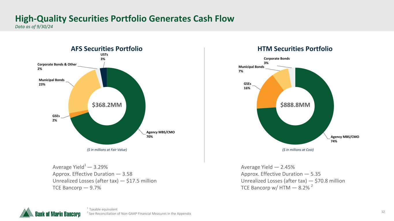 24 Text 95,96,96 Light Gray 232, 232, 232 Black 0, 0, 0 White 255, 255, 255 Accent 1 7,89,52 Accent 2 248,153,40 Accent 3 254,217,129 Accent 4 52,153,70 Accent 5 5,39,67 Accent 6 171,184,195 3.98% 3.55% 3.17% 3.11% 2.63% 2.50% 2.52% 2.70% 4.16% 3.58% 3.36% 3.66% 3.81% 3.65% 3.69% 3.69% Bank of Marin Bancorp Peer Group Median 2019 2020 2021 2022 2023 1Q24 2Q24 3Q24 2.25% 2.50% 2.75% 3.00% 3.25% 3.50% 3.75% 4.00% 4.25% Tax Equivalent Net Interest Margin 1 Peer group includes major exchange-traded Western region banks with assets of $2 billion to $10 billion. Peer data as of June 30, 2024 1 Q2 Balance Sheet Repositioning contributed 30 bps lift in annualized NIM from just prior to repositioning, consistent with expectations
