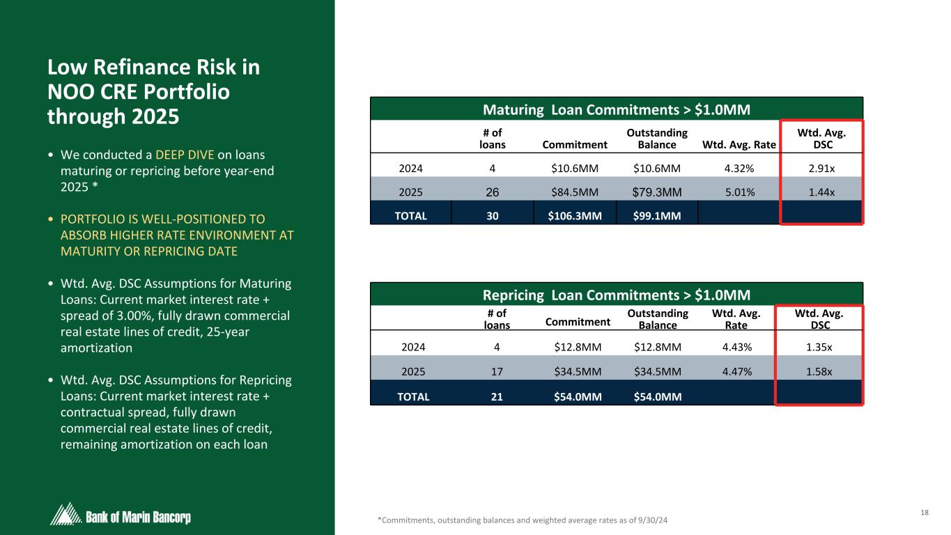 17 Text 95,96,96 Light Gray 232, 232, 232 Black 0, 0, 0 White 255, 255, 255 Accent 1 7,89,52 Accent 2 248,153,40 Accent 3 254,217,129 Accent 4 52,153,70 Accent 5 5,39,67 Accent 6 171,184,195 Well-diversified Loan Portfolio As of 9/30/24 - No material changes from 2Q24 • Loan portfolio is well-diversified across borrowers, industries, loan and property types within our geographic footprint • 86% of all loans and 93% of loans excluding nonprofit organizations are guaranteed by owners of the borrowing entities • Non-owner occupied commercial real estate is well-diversified by property type with 88% of loans (90% of loans excluding nonprofit organizations) being guaranteed by owners of the borrowing entities • Since 2001, net charge-offs for all NOO CRE and OO CRE totals $1.6 million • Construction loans represent a small portion of the overall portfolio OO-CRE 15% C&I 8% Consumer 14% Construction 2% NOO-CRE 61% 3Q24 Total Loans $2.1B Office 28% Mixed Use 8% Retail 20% Warehouse & Industrial 11% Multi-Family 16% Other 17% 3Q24 Total NOO-CRE Loans $1.3B