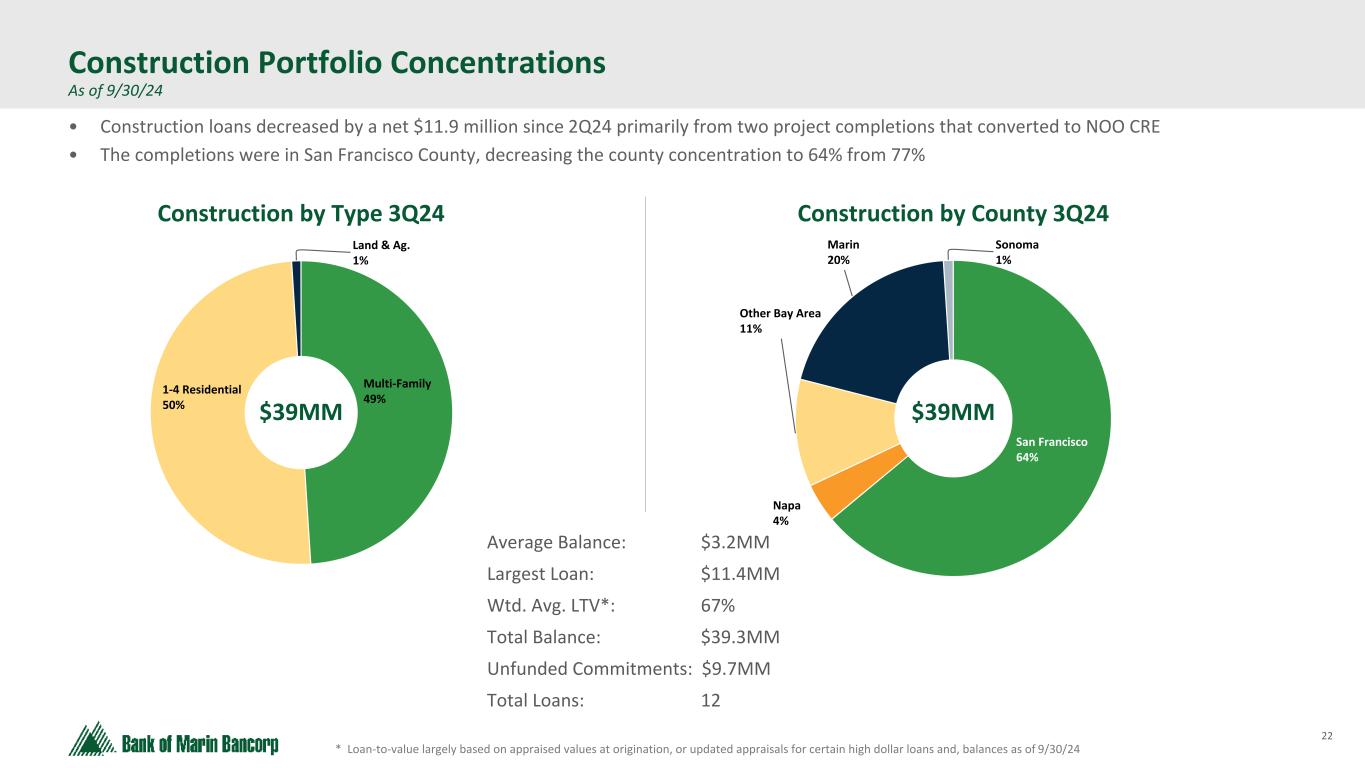 21 Text 95,96,96 Light Gray 232, 232, 232 Black 0, 0, 0 White 255, 255, 255 Accent 1 7,89,52 Accent 2 248,153,40 Accent 3 254,217,129 Accent 4 52,153,70 Accent 5 5,39,67 Accent 6 171,184,195 ($ in millions at Fair Value) * Loan-to-value largely based on appraised values at origination, or updated appraisals for certain classified loans, and balances as of 9/30/24 Owner-Occupied CRE Portfolio As of 9/30/24 - No material changes from 2Q24 Retail 7% School 15% Wine 10% Church 6% Gas/Auto 8% Health Club 4% Mixed Use 3% Other 5% Office 19% Industrial 23% Napa 16% Sacramento 19% San Francisco 4% Sonoma 9% Other 17% Alameda 14% Marin 21% OO CRE by County 3Q24 Average Balance: $1.1MM Largest Loan: $15.2MM Wtd. Avg. LTV*: 47% Total Balance: $325.9MM Total Loans: 299 Note: Shortly after quarter end, one loan for $7.2 million was reclassified from NO OCRE to OO CRE. For the purpose of this presentation, this loan has been included above under the OO CRE category. OO CRE by Type 3Q24 $326MM $326MM