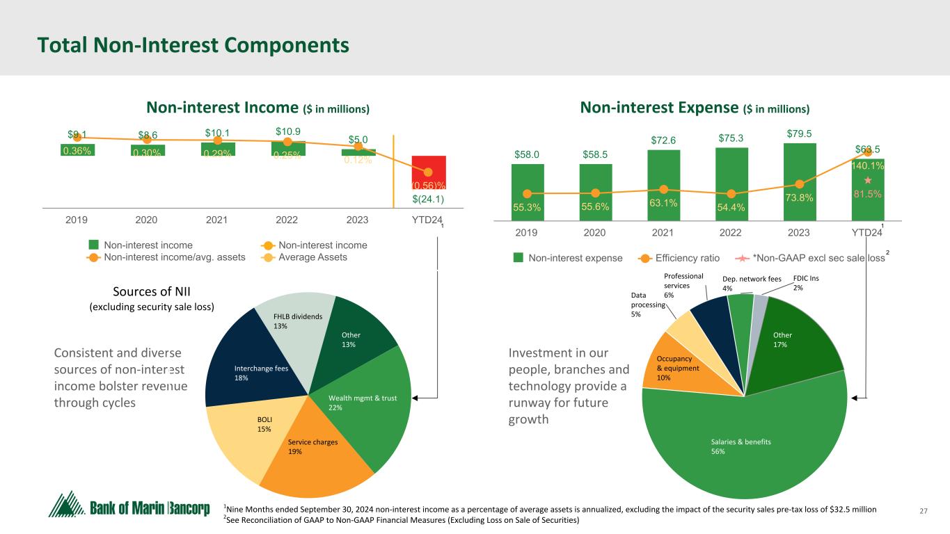 26 Text 95,96,96 Light Gray 232, 232, 232 Black 0, 0, 0 White 255, 255, 255 Accent 1 7,89,52 Accent 2 248,153,40 Accent 3 254,217,129 Accent 4 52,153,70 Accent 5 5,39,67 Accent 6 171,184,195 Loans & Securities — Repricing & Maturity $ in millions, unless otherwise indicated Total Loans1 * at 9/30/2024 Repricing Term Rate Structure 3 mo or less 3-12 mos 1-3 years 3-5 years 5-15 years Over 15 years Total Floating Rate Variable Rate Variable Rate at Floor Variable Rate at Ceiling Fixed Rate C&I $ 62.2 $ 24.2 $ 12.3 $ 32.6 $ 26.5 $ 2.6 $ 160.4 $ 54.0 $ 11.9 $ 23.4 $ — $ 71.1 Real estate: Owner-occupied CRE 0.3 9.3 38.3 61.7 202.1 7.0 318.7 0.2 36.6 97.1 — 184.8 Non-owner occupied CRE 19.0 60.0 214.7 271.5 688.1 13.1 1,266.4 7.8 102.8 347.8 — 808.0 Construction 2.2 31.8 5.3 — — — 39.3 2.2 — 2.0 15.3 19.8 Home equity 0.6 85.2 — — 0.7 — 86.5 85.8 — — — 0.7 Other residential — 7.0 1.0 0.6 1.5 140.5 150.6 — 8.4 106.6 — 35.6 Installment & other consumer 0.3 2.8 7.8 3.1 53.2 1.0 68.2 0.6 8.9 9.3 — 49.4 Total $ 84.6 $ 220.3 $ 279.4 $ 369.5 $ 972.1 $ 164.2 $ 2,090.1 $ 150.6 $ 168.6 $ 586.2 $ 15.3 $ 1,169.4 % of Total 4 % 11 % 13 % 18 % 47 % 7 % 100 % 7 % 8 % 28 % 1 % 56 % Weighted Average Rate 8.24 % 7.26 % 4.82 % 5.15 % 4.35 % 4.69 % 5.04 % 1 Amounts represent amortized cost. Based on maturity date for fixed rate loans and variable rate loans at their floors and ceilings and next repricing date for all other variable rate loans. Does not included prepayment assumptions. Investment Securities2 * at 9/30/24 2 Includes both available-for-sale and held-to-maturity investment securities with prepayment assumptions applied Maturity & Projected Cash Flow Distribution 3 mo or less 3-12 mos 1-3 years 3-5 years 5-10 years Over 10 years Total Principal (par) & interest $ 26.3 $ 204.2 $ 254.8 $ 265.1 $ 458.8 $ 269.6 $ 1,478.8 % of Total 2 % 14 % 17 % 18 % 31 % 18 % 100 %