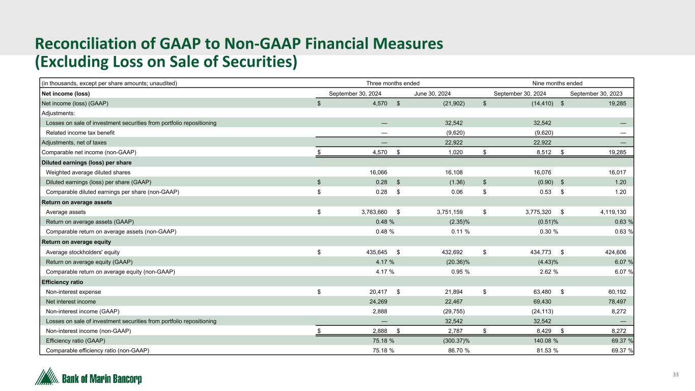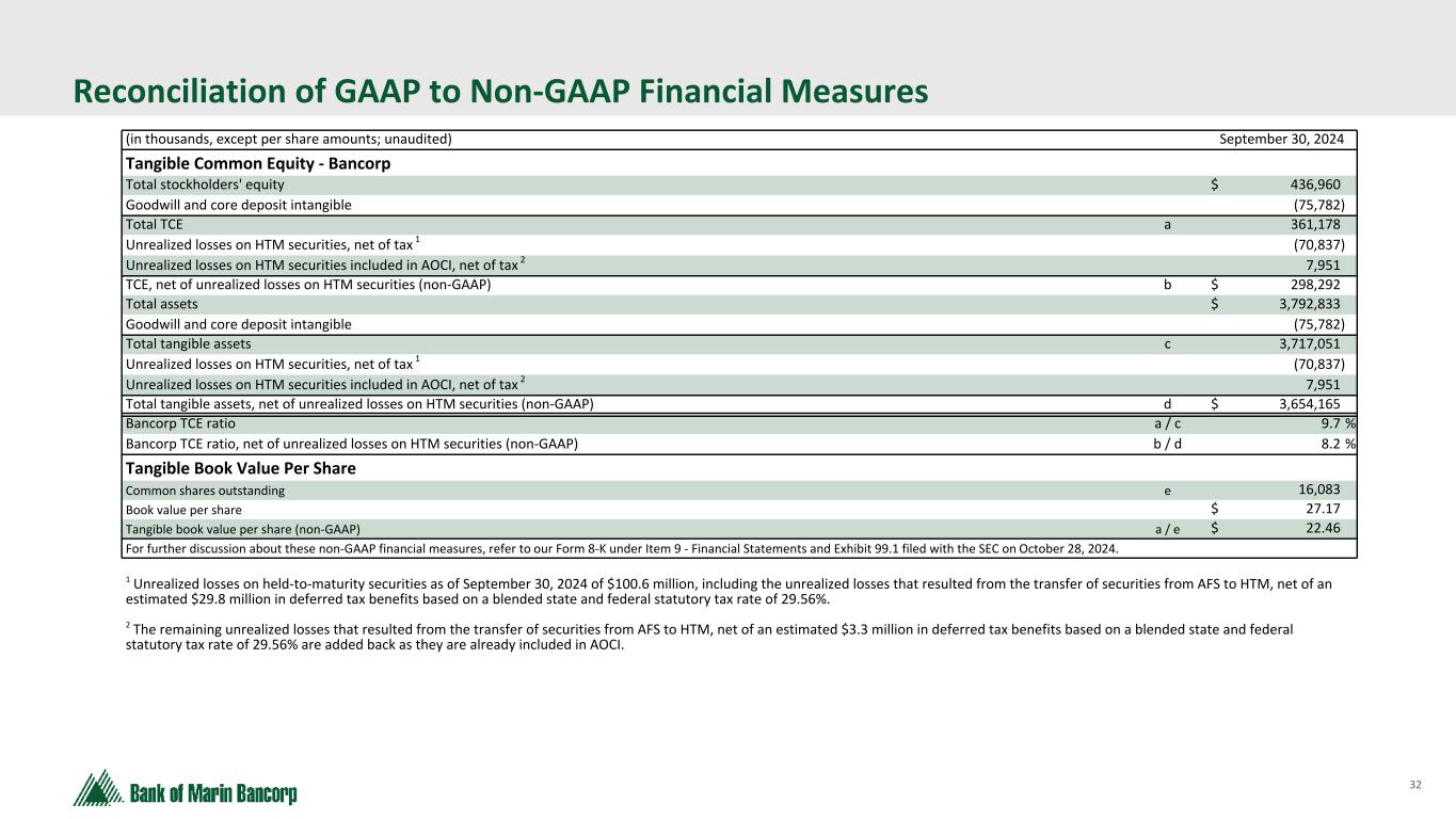 32 Text 95,96,96 Light Gray 232, 232, 232 Black 0, 0, 0 White 255, 255, 255 Accent 1 7,89,52 Accent 2 248,153,40 Accent 3 254,217,129 Accent 4 52,153,70 Accent 5 5,39,67 Accent 6 171,184,195 Reconciliation of GAAP to Non-GAAP Financial Measures (in thousands, except per share amounts; unaudited) September 30, 2024 Tangible Common Equity - Bancorp Total stockholders' equity $ 436,960 Goodwill and core deposit intangible (75,782) Total TCE a 361,178 Unrealized losses on HTM securities, net of tax 1 (70,837) Unrealized losses on HTM securities included in AOCI, net of tax 2 7,951 TCE, net of unrealized losses on HTM securities (non-GAAP) b $ 298,292 Total assets $ 3,792,833 Goodwill and core deposit intangible (75,782) Total tangible assets c 3,717,051 Unrealized losses on HTM securities, net of tax 1 (70,837) Unrealized losses on HTM securities included in AOCI, net of tax 2 7,951 Total tangible assets, net of unrealized losses on HTM securities (non-GAAP) d $ 3,654,165 Bancorp TCE ratio a / c 9.7 % Bancorp TCE ratio, net of unrealized losses on HTM securities (non-GAAP) b / d 8.2 % Tangible Book Value Per Share Common shares outstanding e 16,083 Book value per share $ 27.17 Tangible book value per share (non-GAAP) a / e $ 22.46 For further discussion about these non-GAAP financial measures, refer to our Form 8-K under Item 9 - Financial Statements and Exhibit 99.1 filed with the SEC on October 28, 2024. 1 Unrealized losses on held-to-maturity securities as of September 30, 2024 of $100.6 million, including the unrealized losses that resulted from the transfer of securities from AFS to HTM, net of an estimated $29.8 million in deferred tax benefits based on a blended state and federal statutory tax rate of 29.56%. 2 The remaining unrealized losses that resulted from the transfer of securities from AFS to HTM, net of an estimated $3.3 million in deferred tax benefits based on a blended state and federal statutory tax rate of 29.56% are added back as they are already included in AOCI.