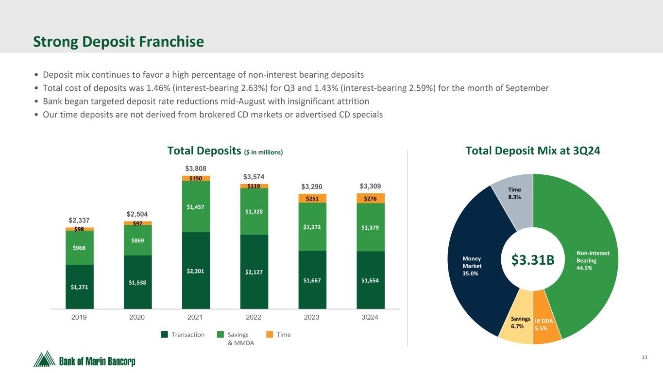 12 Text 95,96,96 Light Gray 232, 232, 232 Black 0, 0, 0 White 255, 255, 255 Accent 1 7,89,52 Accent 2 248,153,40 Accent 3 254,217,129 Accent 4 52,153,70 Accent 5 5,39,67 Accent 6 171,184,195 1 Taxable equivalent 2 See Reconciliation of Non-GAAP Financial Measures in the Appendix High-Quality Securities Portfolio Generates Cash Flow Data as of 9/30/24 AFS Securities Portfolio Agency MBS/CMO 70% GSEs 2% Municipal Bonds 23% Corporate Bonds & Other 2% USTs 3% ($ in millions at Fair Value) $368.2MM HTM Securities Portfolio Agency MBS/CMO 74% GSEs 16% Municipal Bonds 7% Corporate Bonds 3% $888.8MM ($ in millions at Cost) Average Yield1 — 3.29% Approx. Effective Duration — 3.58 Unrealized Losses (after tax) — $17.5 million TCE Bancorp — 9.7% Average Yield — 2.45% Approx. Effective Duration — 5.35 Unrealized Losses (after tax) — $70.8 million TCE Bancorp w/ HTM — 8.2% 2