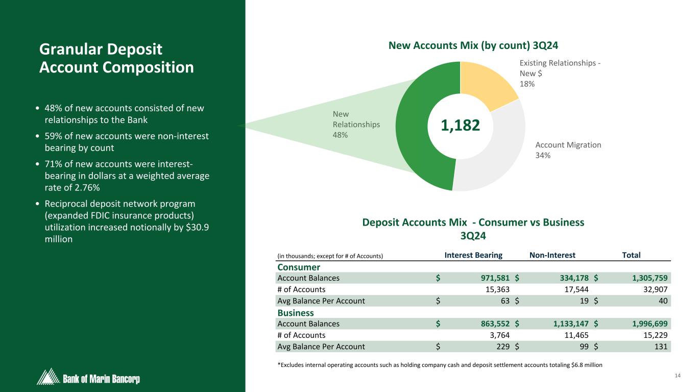 13 Text 95,96,96 Light Gray 232, 232, 232 Black 0, 0, 0 White 255, 255, 255 Accent 1 7,89,52 Accent 2 248,153,40 Accent 3 254,217,129 Accent 4 52,153,70 Accent 5 5,39,67 Accent 6 171,184,195 Strong Deposit Franchise • Deposit mix continues to favor a high percentage of non-interest bearing deposits • Total cost of deposits was 1.46% (interest-bearing 2.63%) for Q3 and 1.43% (interest-bearing 2.59%) for the month of September • Bank began targeted deposit rate reductions mid-August with insignificant attrition • Our time deposits are not derived from brokered CD markets or advertised CD specials Total Deposit Mix at 3Q24Total Deposits ($ in millions) $2,337 $2,504 $3,808 $3,574 $3,290 $3,309 $1,271 $1,538 $2,201 $2,127 $1,667 $1,654 $968 $869 $1,457 $1,328 $1,372 $1,379$98 $97 $150 $119 $251 $276 Transaction Savings & MMDA Time 2019 2020 2021 2022 2023 3Q24 Non-Interest Bearing 44.5% IB DDA 5.5% Savings 6.7% Money Market 35.0% Time 8.3% $3.31B