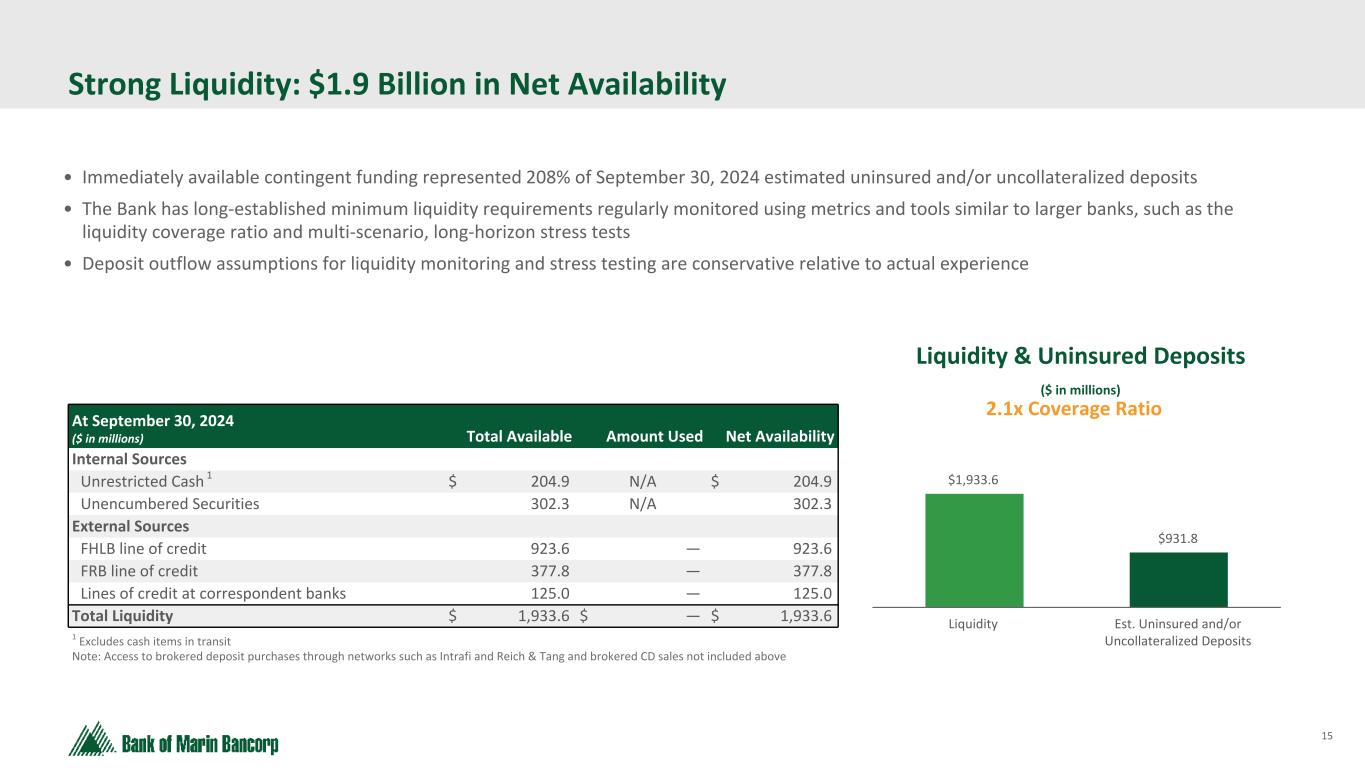 14 Text 95,96,96 Light Gray 232, 232, 232 Black 0, 0, 0 White 255, 255, 255 Accent 1 7,89,52 Accent 2 248,153,40 Accent 3 254,217,129 Accent 4 52,153,70 Accent 5 5,39,67 Accent 6 171,184,195 • 48% of new accounts consisted of new relationships to the Bank • 59% of new accounts were non-interest bearing by count • 71% of new accounts were interest- bearing in dollars at a weighted average rate of 2.76% • Reciprocal deposit network program (expanded FDIC insurance products) utilization increased notionally by $30.9 million New Accounts Mix (by count) 3Q24Granular Deposit Account Composition Existing Relationships - New $ 18% Account Migration 34% New Relationships 48% 1,182 (in thousands; except for # of Accounts) Interest Bearing Non-Interest Bearing Total Consumer Account Balances $ 971,581 $ 334,178 $ 1,305,759 # of Accounts 15,363 17,544 32,907 Avg Balance Per Account $ 63 $ 19 $ 40 Business Account Balances $ 863,552 $ 1,133,147 $ 1,996,699 # of Accounts 3,764 11,465 15,229 Avg Balance Per Account $ 229 $ 99 $ 131 *Excludes internal operating accounts such as holding company cash and deposit settlement accounts totaling $6.8 million Deposit Accounts Mix - Consumer vs Business 3Q24