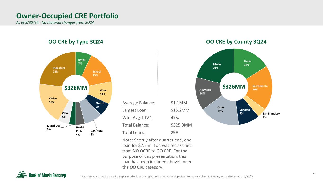 20 Text 95,96,96 Light Gray 232, 232, 232 Black 0, 0, 0 White 255, 255, 255 Accent 1 7,89,52 Accent 2 248,153,40 Accent 3 254,217,129 Accent 4 52,153,70 Accent 5 5,39,67 Accent 6 171,184,195 * Calculated for loans exceeding $1 million, based on the most recent annual review process Note: Sacramento includes surrounding regional counties NOO CRE Portfolio Diversified Across Property Type & County As of 9/30/24 - No material changes from 2Q24 Average Balance: $1.8MM Largest Balance: $13.8MM Total # of Loans: 141 Wtd. Avg. LTV*: 58% Average Balance: $1.9MM Largest Balance: $14.6MM Total # of Loans: 73 Wtd. Avg. LTV*: 55% Average Balance: $1.7MM Largest Balance: $21.6MM Total # of Loans: 121 Wtd. Avg. LTV*: 63% San Francisco 3% Alameda 5% Sacramento 21% Napa 17% Other Bay Area 15% Other 9% Marin 16% Sonoma 14% San Francisco 11% Alameda 18% Sacramento 18% Napa 3% Other Bay Area 4% Other 6% Marin 11% Sonoma 29% San Francisco 32% Alameda 20%Sacramento 6% Napa 5% Other Bay Area 5% Other 9% Marin 11% Sonoma 12% Retail 3Q24 Warehouse & Industrial 3Q24 Multifamily 3Q24 $247MM $136MM $207MM