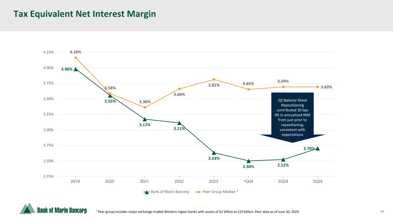 24 Text 95,96,96 Light Gray 232, 232, 232 Black 0, 0, 0 White 255, 255, 255 Accent 1 7,89,52 Accent 2 248,153,40 Accent 3 254,217,129 Accent 4 52,153,70 Accent 5 5,39,67 Accent 6 171,184,195 3.98% 3.55% 3.17% 3.11% 2.63% 2.50% 2.52% 2.70% 4.16% 3.58% 3.36% 3.66% 3.81% 3.65% 3.69% 3.69% Bank of Marin Bancorp Peer Group Median 2019 2020 2021 2022 2023 1Q24 2Q24 3Q24 2.25% 2.50% 2.75% 3.00% 3.25% 3.50% 3.75% 4.00% 4.25% Tax Equivalent Net Interest Margin 1 Peer group includes major exchange-traded Western region banks with assets of $2 billion to $10 billion. Peer data as of June 30, 2024 1 Q2 Balance Sheet Repositioning contributed 30 bps lift in annualized NIM from just prior to repositioning, consistent with expectations