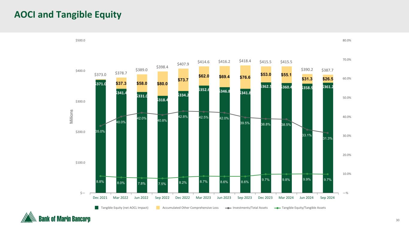 30 Text 95,96,96 Light Gray 232, 232, 232 Black 0, 0, 0 White 255, 255, 255 Accent 1 7,89,52 Accent 2 248,153,40 Accent 3 254,217,129 Accent 4 52,153,70 Accent 5 5,39,67 Accent 6 171,184,195 AOCI and Tangible Equity M ill io ns $373.0 $378.7 $389.0 $398.4 $407.9 $414.6 $416.2 $418.4 $415.5 $415.5 $390.2 $387.7 $371.0 $341.4 $331.0 $318.4 $334.2 $352.6 $346.8 $341.8 $362.5 $360.4 $358.9 $361.2 $37.3 $58.0 $80.0 $73.7 $62.0 $69.4 $76.6 $53.0 $55.1 $31.3 $26.5 35.0% 40.0% 42.0% 40.8% 42.8% 42.5% 42.0% 39.5% 38.8% 38.5% 33.1% 31.3% 8.8% 8.0% 7.8% 7.5% 8.2% 8.7% 8.6% 8.6% 9.7% 9.8% 9.9% 9.7% Tangible Equity (net AOCL Impact) Accumulated Other Comprehensive Loss Investments/Total Assets Tangible Equity/Tangible Assets Dec 2021 Mar 2022 Jun 2022 Sep 2022 Dec 2022 Mar 2023 Jun 2023 Sep 2023 Dec 2023 Mar 2024 Jun 2024 Sep 2024 $— $100.0 $200.0 $300.0 $400.0 $500.0 —% 10.0% 20.0% 30.0% 40.0% 50.0% 60.0% 70.0% 80.0%