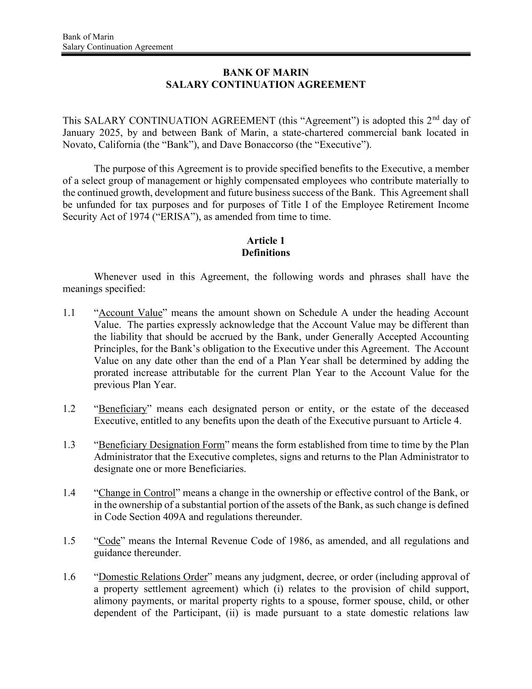 Bank of Marin Salary Continuation Agreement BANK OF MARIN SALARY CONTINUATION AGREEMENT This SALARY CONTINUATION AGREEMENT (this “Agreement”) is adopted this 2nd day of January 2025, by and between Bank of Marin, a state-chartered commercial bank located in Novato, California (the “Bank”), and Dave Bonaccorso (the “Executive”). The purpose of this Agreement is to provide specified benefits to the Executive, a member of a select group of management or highly compensated employees who contribute materially to the continued growth, development and future business success of the Bank. This Agreement shall be unfunded for tax purposes and for purposes of Title I of the Employee Retirement Income Security Act of 1974 (“ERISA”), as amended from time to time. Article 1 Definitions Whenever used in this Agreement, the following words and phrases shall have the meanings specified: 1.1 “Account Value” means the amount shown on Schedule A under the heading Account Value. The parties expressly acknowledge that the Account Value may be different than the liability that should be accrued by the Bank, under Generally Accepted Accounting Principles, for the Bank’s obligation to the Executive under this Agreement. The Account Value on any date other than the end of a Plan Year shall be determined by adding the prorated increase attributable for the current Plan Year to the Account Value for the previous Plan Year. 1.2 “Beneficiary” means each designated person or entity, or the estate of the deceased Executive, entitled to any benefits upon the death of the Executive pursuant to Article 4. 1.3 “Beneficiary Designation Form” means the form established from time to time by the Plan Administrator that the Executive completes, signs and returns to the Plan Administrator to designate one or more Beneficiaries. 1.4 “Change in Control” means a change in the ownership or effective control of the Bank, or in the ownership of a substantial portion of the assets of the Bank, as such change is defined in Code Section 409A and regulations thereunder. 1.5 “Code” means the Internal Revenue Code of 1986, as amended, and all regulations and guidance thereunder. 1.6 “Domestic Relations Order” means any judgment, decree, or order (including approval of a property settlement agreement) which (i) relates to the provision of child support, alimony payments, or marital property rights to a spouse, former spouse, child, or other dependent of the Participant, (ii) is made pursuant to a state domestic relations law