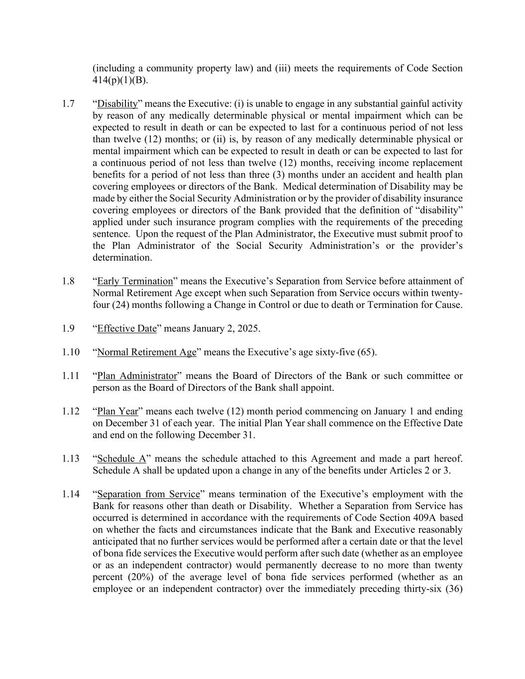 (including a community property law) and (iii) meets the requirements of Code Section 414(p)(1)(B). 1.7 “Disability” means the Executive: (i) is unable to engage in any substantial gainful activity by reason of any medically determinable physical or mental impairment which can be expected to result in death or can be expected to last for a continuous period of not less than twelve (12) months; or (ii) is, by reason of any medically determinable physical or mental impairment which can be expected to result in death or can be expected to last for a continuous period of not less than twelve (12) months, receiving income replacement benefits for a period of not less than three (3) months under an accident and health plan covering employees or directors of the Bank. Medical determination of Disability may be made by either the Social Security Administration or by the provider of disability insurance covering employees or directors of the Bank provided that the definition of “disability” applied under such insurance program complies with the requirements of the preceding sentence. Upon the request of the Plan Administrator, the Executive must submit proof to the Plan Administrator of the Social Security Administration’s or the provider’s determination. 1.8 “Early Termination” means the Executive’s Separation from Service before attainment of Normal Retirement Age except when such Separation from Service occurs within twenty- four (24) months following a Change in Control or due to death or Termination for Cause. 1.9 “Effective Date” means January 2, 2025. 1.10 “Normal Retirement Age” means the Executive’s age sixty-five (65). 1.11 “Plan Administrator” means the Board of Directors of the Bank or such committee or person as the Board of Directors of the Bank shall appoint. 1.12 “Plan Year” means each twelve (12) month period commencing on January 1 and ending on December 31 of each year. The initial Plan Year shall commence on the Effective Date and end on the following December 31. 1.13 “Schedule A” means the schedule attached to this Agreement and made a part hereof. Schedule A shall be updated upon a change in any of the benefits under Articles 2 or 3. 1.14 “Separation from Service” means termination of the Executive’s employment with the Bank for reasons other than death or Disability. Whether a Separation from Service has occurred is determined in accordance with the requirements of Code Section 409A based on whether the facts and circumstances indicate that the Bank and Executive reasonably anticipated that no further services would be performed after a certain date or that the level of bona fide services the Executive would perform after such date (whether as an employee or as an independent contractor) would permanently decrease to no more than twenty percent (20%) of the average level of bona fide services performed (whether as an employee or an independent contractor) over the immediately preceding thirty-six (36)