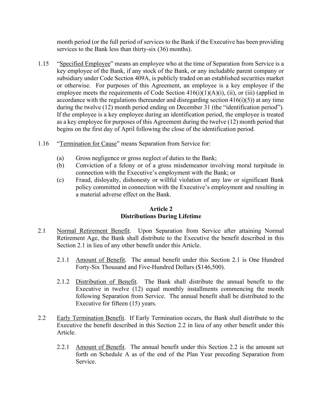 month period (or the full period of services to the Bank if the Executive has been providing services to the Bank less than thirty-six (36) months). 1.15 “Specified Employee” means an employee who at the time of Separation from Service is a key employee of the Bank, if any stock of the Bank, or any includable parent company or subsidiary under Code Section 409A, is publicly traded on an established securities market or otherwise. For purposes of this Agreement, an employee is a key employee if the employee meets the requirements of Code Section 416(i)(1)(A)(i), (ii), or (iii) (applied in accordance with the regulations thereunder and disregarding section 416(i)(5)) at any time during the twelve (12) month period ending on December 31 (the “identification period”). If the employee is a key employee during an identification period, the employee is treated as a key employee for purposes of this Agreement during the twelve (12) month period that begins on the first day of April following the close of the identification period. 1.16 “Termination for Cause” means Separation from Service for: (a) Gross negligence or gross neglect of duties to the Bank; (b) Conviction of a felony or of a gross misdemeanor involving moral turpitude in connection with the Executive’s employment with the Bank; or (c) Fraud, disloyalty, dishonesty or willful violation of any law or significant Bank policy committed in connection with the Executive’s employment and resulting in a material adverse effect on the Bank. Article 2 Distributions During Lifetime 2.1 Normal Retirement Benefit. Upon Separation from Service after attaining Normal Retirement Age, the Bank shall distribute to the Executive the benefit described in this Section 2.1 in lieu of any other benefit under this Article. 2.1.1 Amount of Benefit. The annual benefit under this Section 2.1 is One Hundred Forty-Six Thousand and Five-Hundred Dollars ($146,500). 2.1.2 Distribution of Benefit. The Bank shall distribute the annual benefit to the Executive in twelve (12) equal monthly installments commencing the month following Separation from Service. The annual benefit shall be distributed to the Executive for fifteen (15) years. 2.2 Early Termination Benefit. If Early Termination occurs, the Bank shall distribute to the Executive the benefit described in this Section 2.2 in lieu of any other benefit under this Article. 2.2.1 Amount of Benefit. The annual benefit under this Section 2.2 is the amount set forth on Schedule A as of the end of the Plan Year preceding Separation from Service.