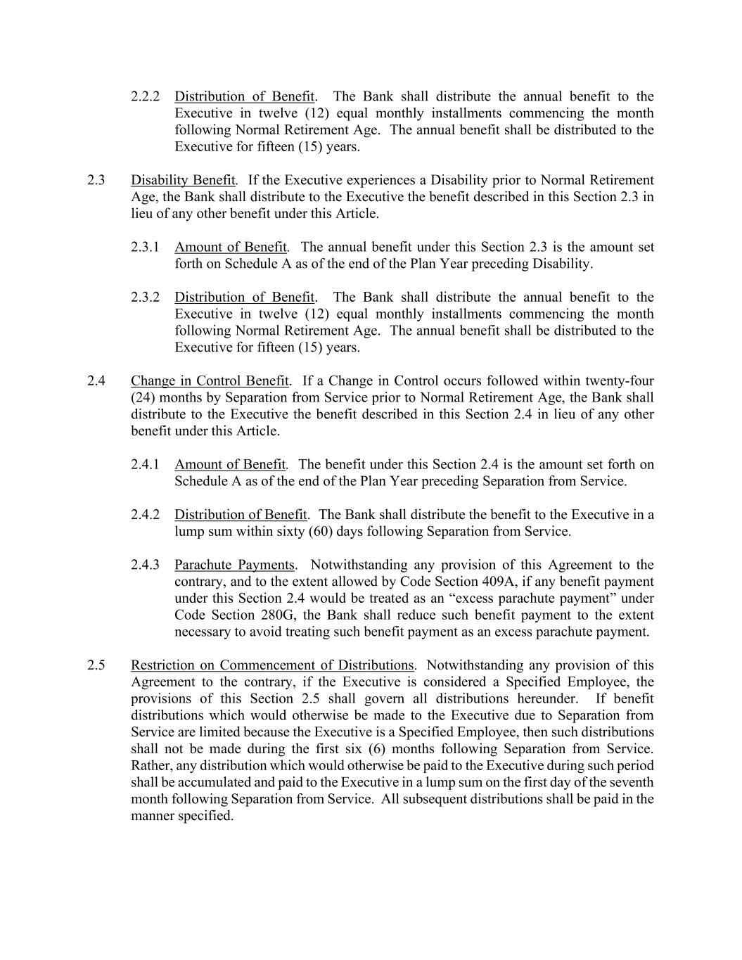 2.2.2 Distribution of Benefit. The Bank shall distribute the annual benefit to the Executive in twelve (12) equal monthly installments commencing the month following Normal Retirement Age. The annual benefit shall be distributed to the Executive for fifteen (15) years. 2.3 Disability Benefit. If the Executive experiences a Disability prior to Normal Retirement Age, the Bank shall distribute to the Executive the benefit described in this Section 2.3 in lieu of any other benefit under this Article. 2.3.1 Amount of Benefit. The annual benefit under this Section 2.3 is the amount set forth on Schedule A as of the end of the Plan Year preceding Disability. 2.3.2 Distribution of Benefit. The Bank shall distribute the annual benefit to the Executive in twelve (12) equal monthly installments commencing the month following Normal Retirement Age. The annual benefit shall be distributed to the Executive for fifteen (15) years. 2.4 Change in Control Benefit. If a Change in Control occurs followed within twenty-four (24) months by Separation from Service prior to Normal Retirement Age, the Bank shall distribute to the Executive the benefit described in this Section 2.4 in lieu of any other benefit under this Article. 2.4.1 Amount of Benefit. The benefit under this Section 2.4 is the amount set forth on Schedule A as of the end of the Plan Year preceding Separation from Service. 2.4.2 Distribution of Benefit. The Bank shall distribute the benefit to the Executive in a lump sum within sixty (60) days following Separation from Service. 2.4.3 Parachute Payments. Notwithstanding any provision of this Agreement to the contrary, and to the extent allowed by Code Section 409A, if any benefit payment under this Section 2.4 would be treated as an “excess parachute payment” under Code Section 280G, the Bank shall reduce such benefit payment to the extent necessary to avoid treating such benefit payment as an excess parachute payment. 2.5 Restriction on Commencement of Distributions. Notwithstanding any provision of this Agreement to the contrary, if the Executive is considered a Specified Employee, the provisions of this Section 2.5 shall govern all distributions hereunder. If benefit distributions which would otherwise be made to the Executive due to Separation from Service are limited because the Executive is a Specified Employee, then such distributions shall not be made during the first six (6) months following Separation from Service. Rather, any distribution which would otherwise be paid to the Executive during such period shall be accumulated and paid to the Executive in a lump sum on the first day of the seventh month following Separation from Service. All subsequent distributions shall be paid in the manner specified.