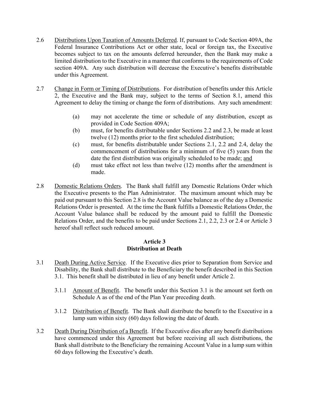 2.6 Distributions Upon Taxation of Amounts Deferred. If, pursuant to Code Section 409A, the Federal Insurance Contributions Act or other state, local or foreign tax, the Executive becomes subject to tax on the amounts deferred hereunder, then the Bank may make a limited distribution to the Executive in a manner that conforms to the requirements of Code section 409A. Any such distribution will decrease the Executive’s benefits distributable under this Agreement. 2.7 Change in Form or Timing of Distributions. For distribution of benefits under this Article 2, the Executive and the Bank may, subject to the terms of Section 8.1, amend this Agreement to delay the timing or change the form of distributions. Any such amendment: (a) may not accelerate the time or schedule of any distribution, except as provided in Code Section 409A; (b) must, for benefits distributable under Sections 2.2 and 2.3, be made at least twelve (12) months prior to the first scheduled distribution; (c) must, for benefits distributable under Sections 2.1, 2.2 and 2.4, delay the commencement of distributions for a minimum of five (5) years from the date the first distribution was originally scheduled to be made; and (d) must take effect not less than twelve (12) months after the amendment is made. 2.8 Domestic Relations Orders. The Bank shall fulfill any Domestic Relations Order which the Executive presents to the Plan Administrator. The maximum amount which may be paid out pursuant to this Section 2.8 is the Account Value balance as of the day a Domestic Relations Order is presented. At the time the Bank fulfills a Domestic Relations Order, the Account Value balance shall be reduced by the amount paid to fulfill the Domestic Relations Order, and the benefits to be paid under Sections 2.1, 2.2, 2.3 or 2.4 or Article 3 hereof shall reflect such reduced amount. Article 3 Distribution at Death 3.1 Death During Active Service. If the Executive dies prior to Separation from Service and Disability, the Bank shall distribute to the Beneficiary the benefit described in this Section 3.1. This benefit shall be distributed in lieu of any benefit under Article 2. 3.1.1 Amount of Benefit. The benefit under this Section 3.1 is the amount set forth on Schedule A as of the end of the Plan Year preceding death. 3.1.2 Distribution of Benefit. The Bank shall distribute the benefit to the Executive in a lump sum within sixty (60) days following the date of death. 3.2 Death During Distribution of a Benefit. If the Executive dies after any benefit distributions have commenced under this Agreement but before receiving all such distributions, the Bank shall distribute to the Beneficiary the remaining Account Value in a lump sum within 60 days following the Executive’s death.