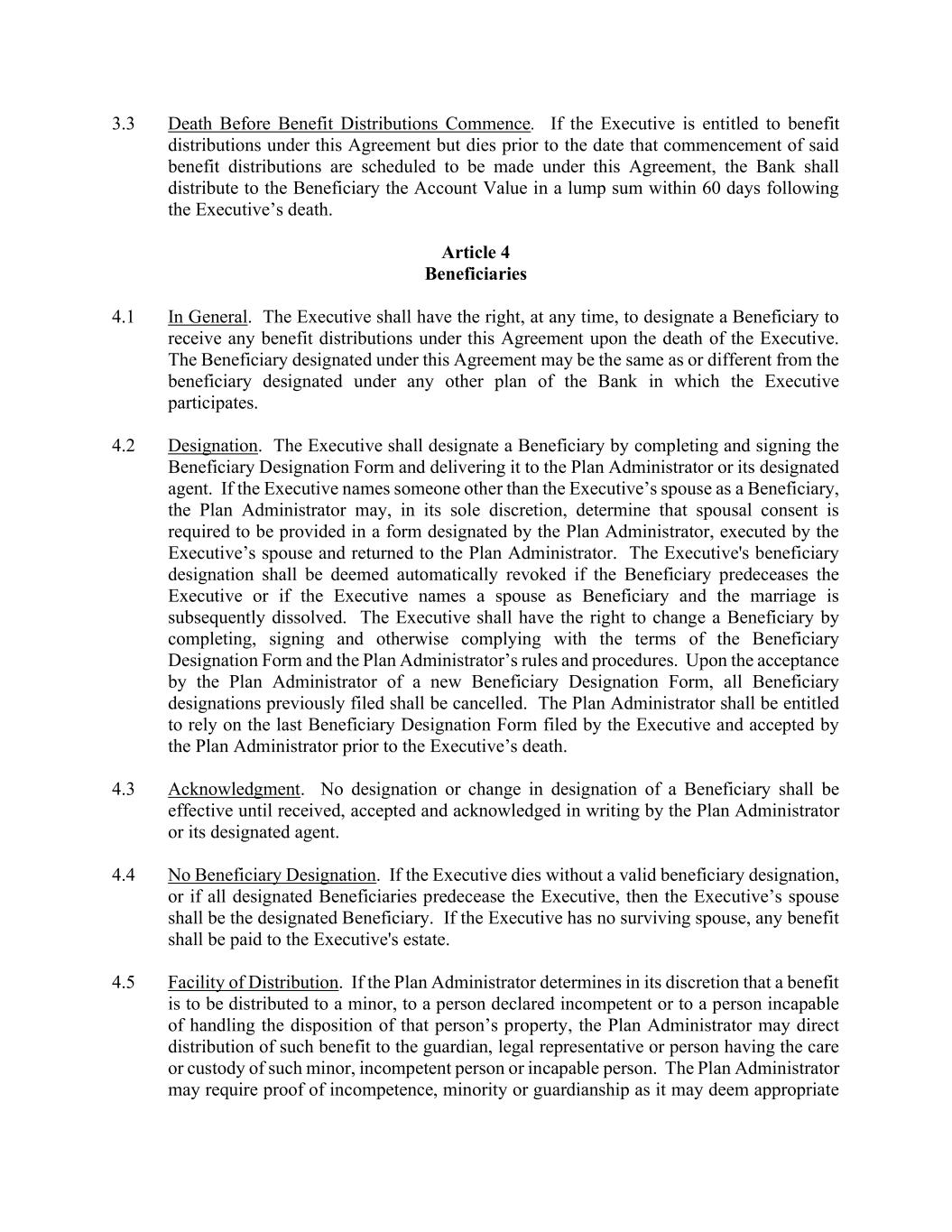 3.3 Death Before Benefit Distributions Commence. If the Executive is entitled to benefit distributions under this Agreement but dies prior to the date that commencement of said benefit distributions are scheduled to be made under this Agreement, the Bank shall distribute to the Beneficiary the Account Value in a lump sum within 60 days following the Executive’s death. Article 4 Beneficiaries 4.1 In General. The Executive shall have the right, at any time, to designate a Beneficiary to receive any benefit distributions under this Agreement upon the death of the Executive. The Beneficiary designated under this Agreement may be the same as or different from the beneficiary designated under any other plan of the Bank in which the Executive participates. 4.2 Designation. The Executive shall designate a Beneficiary by completing and signing the Beneficiary Designation Form and delivering it to the Plan Administrator or its designated agent. If the Executive names someone other than the Executive’s spouse as a Beneficiary, the Plan Administrator may, in its sole discretion, determine that spousal consent is required to be provided in a form designated by the Plan Administrator, executed by the Executive’s spouse and returned to the Plan Administrator. The Executive's beneficiary designation shall be deemed automatically revoked if the Beneficiary predeceases the Executive or if the Executive names a spouse as Beneficiary and the marriage is subsequently dissolved. The Executive shall have the right to change a Beneficiary by completing, signing and otherwise complying with the terms of the Beneficiary Designation Form and the Plan Administrator’s rules and procedures. Upon the acceptance by the Plan Administrator of a new Beneficiary Designation Form, all Beneficiary designations previously filed shall be cancelled. The Plan Administrator shall be entitled to rely on the last Beneficiary Designation Form filed by the Executive and accepted by the Plan Administrator prior to the Executive’s death. 4.3 Acknowledgment. No designation or change in designation of a Beneficiary shall be effective until received, accepted and acknowledged in writing by the Plan Administrator or its designated agent. 4.4 No Beneficiary Designation. If the Executive dies without a valid beneficiary designation, or if all designated Beneficiaries predecease the Executive, then the Executive’s spouse shall be the designated Beneficiary. If the Executive has no surviving spouse, any benefit shall be paid to the Executive's estate. 4.5 Facility of Distribution. If the Plan Administrator determines in its discretion that a benefit is to be distributed to a minor, to a person declared incompetent or to a person incapable of handling the disposition of that person’s property, the Plan Administrator may direct distribution of such benefit to the guardian, legal representative or person having the care or custody of such minor, incompetent person or incapable person. The Plan Administrator may require proof of incompetence, minority or guardianship as it may deem appropriate