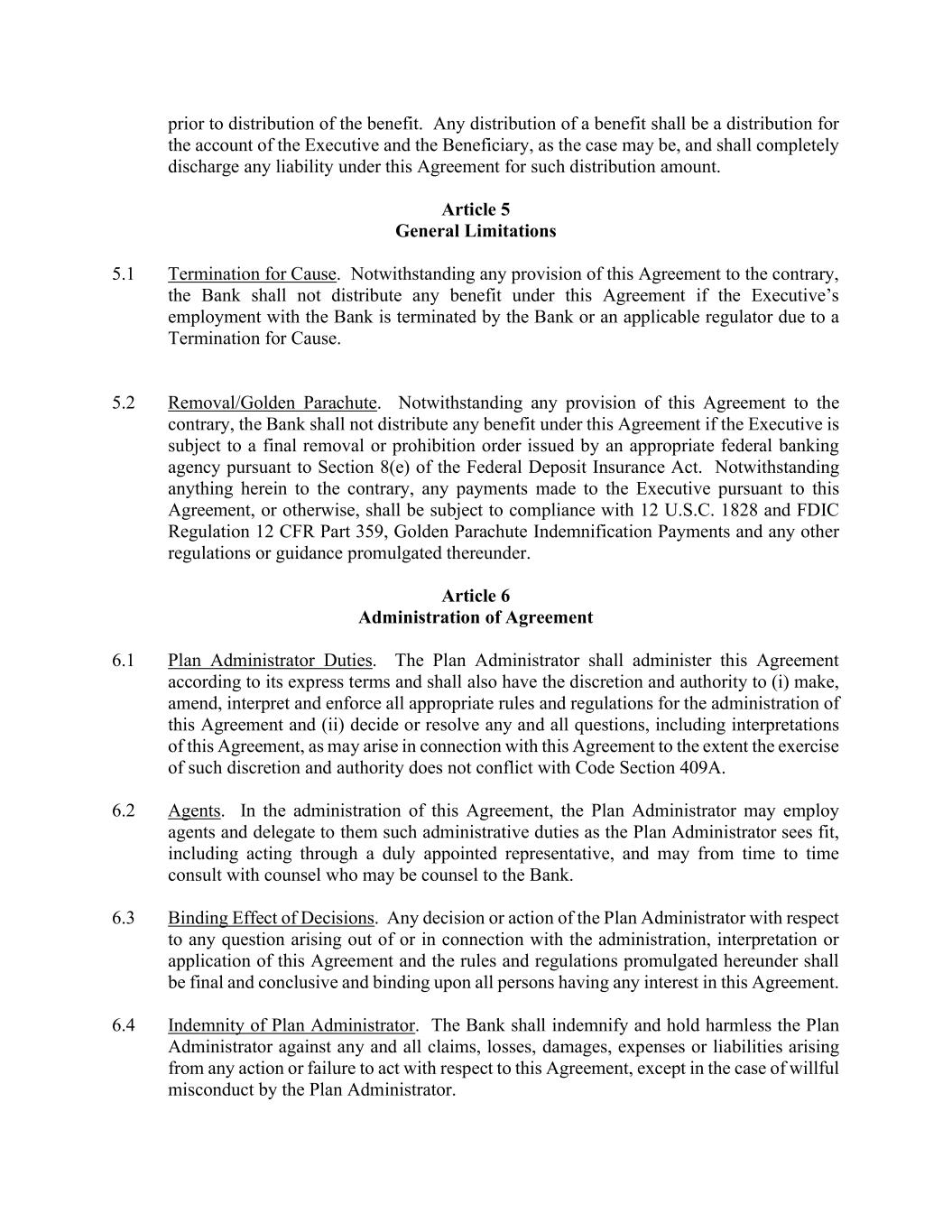 prior to distribution of the benefit. Any distribution of a benefit shall be a distribution for the account of the Executive and the Beneficiary, as the case may be, and shall completely discharge any liability under this Agreement for such distribution amount. Article 5 General Limitations 5.1 Termination for Cause. Notwithstanding any provision of this Agreement to the contrary, the Bank shall not distribute any benefit under this Agreement if the Executive’s employment with the Bank is terminated by the Bank or an applicable regulator due to a Termination for Cause. 5.2 Removal/Golden Parachute. Notwithstanding any provision of this Agreement to the contrary, the Bank shall not distribute any benefit under this Agreement if the Executive is subject to a final removal or prohibition order issued by an appropriate federal banking agency pursuant to Section 8(e) of the Federal Deposit Insurance Act. Notwithstanding anything herein to the contrary, any payments made to the Executive pursuant to this Agreement, or otherwise, shall be subject to compliance with 12 U.S.C. 1828 and FDIC Regulation 12 CFR Part 359, Golden Parachute Indemnification Payments and any other regulations or guidance promulgated thereunder. Article 6 Administration of Agreement 6.1 Plan Administrator Duties. The Plan Administrator shall administer this Agreement according to its express terms and shall also have the discretion and authority to (i) make, amend, interpret and enforce all appropriate rules and regulations for the administration of this Agreement and (ii) decide or resolve any and all questions, including interpretations of this Agreement, as may arise in connection with this Agreement to the extent the exercise of such discretion and authority does not conflict with Code Section 409A. 6.2 Agents. In the administration of this Agreement, the Plan Administrator may employ agents and delegate to them such administrative duties as the Plan Administrator sees fit, including acting through a duly appointed representative, and may from time to time consult with counsel who may be counsel to the Bank. 6.3 Binding Effect of Decisions. Any decision or action of the Plan Administrator with respect to any question arising out of or in connection with the administration, interpretation or application of this Agreement and the rules and regulations promulgated hereunder shall be final and conclusive and binding upon all persons having any interest in this Agreement. 6.4 Indemnity of Plan Administrator. The Bank shall indemnify and hold harmless the Plan Administrator against any and all claims, losses, damages, expenses or liabilities arising from any action or failure to act with respect to this Agreement, except in the case of willful misconduct by the Plan Administrator.