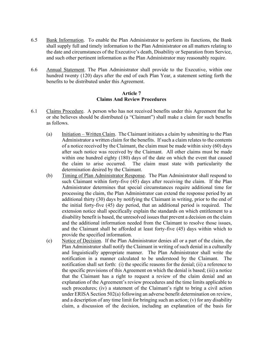 6.5 Bank Information. To enable the Plan Administrator to perform its functions, the Bank shall supply full and timely information to the Plan Administrator on all matters relating to the date and circumstances of the Executive’s death, Disability or Separation from Service, and such other pertinent information as the Plan Administrator may reasonably require. 6.6 Annual Statement. The Plan Administrator shall provide to the Executive, within one hundred twenty (120) days after the end of each Plan Year, a statement setting forth the benefits to be distributed under this Agreement. Article 7 Claims And Review Procedures 6.1 Claims Procedure. A person who has not received benefits under this Agreement that he or she believes should be distributed (a “Claimant”) shall make a claim for such benefits as follows. (a) Initiation – Written Claim. The Claimant initiates a claim by submitting to the Plan Administrator a written claim for the benefits. If such a claim relates to the contents of a notice received by the Claimant, the claim must be made within sixty (60) days after such notice was received by the Claimant. All other claims must be made within one hundred eighty (180) days of the date on which the event that caused the claim to arise occurred. The claim must state with particularity the determination desired by the Claimant. (b) Timing of Plan Administrator Response. The Plan Administrator shall respond to such Claimant within forty-five (45) days after receiving the claim. If the Plan Administrator determines that special circumstances require additional time for processing the claim, the Plan Administrator can extend the response period by an additional thirty (30) days by notifying the Claimant in writing, prior to the end of the initial forty-five (45) day period, that an additional period is required. The extension notice shall specifically explain the standards on which entitlement to a disability benefit is based, the unresolved issues that prevent a decision on the claim and the additional information needed from the Claimant to resolve those issues, and the Claimant shall be afforded at least forty-five (45) days within which to provide the specified information. (c) Notice of Decision. If the Plan Administrator denies all or a part of the claim, the Plan Administrator shall notify the Claimant in writing of such denial in a culturally and linguistically appropriate manner. The Plan Administrator shall write the notification in a manner calculated to be understood by the Claimant. The notification shall set forth: (i) the specific reasons for the denial; (ii) a reference to the specific provisions of this Agreement on which the denial is based; (iii) a notice that the Claimant has a right to request a review of the claim denial and an explanation of the Agreement’s review procedures and the time limits applicable to such procedures; (iv) a statement of the Claimant’s right to bring a civil action under ERISA Section 502(a) following an adverse benefit determination on review, and a description of any time limit for bringing such an action; (v) for any disability claim, a discussion of the decision, including an explanation of the basis for