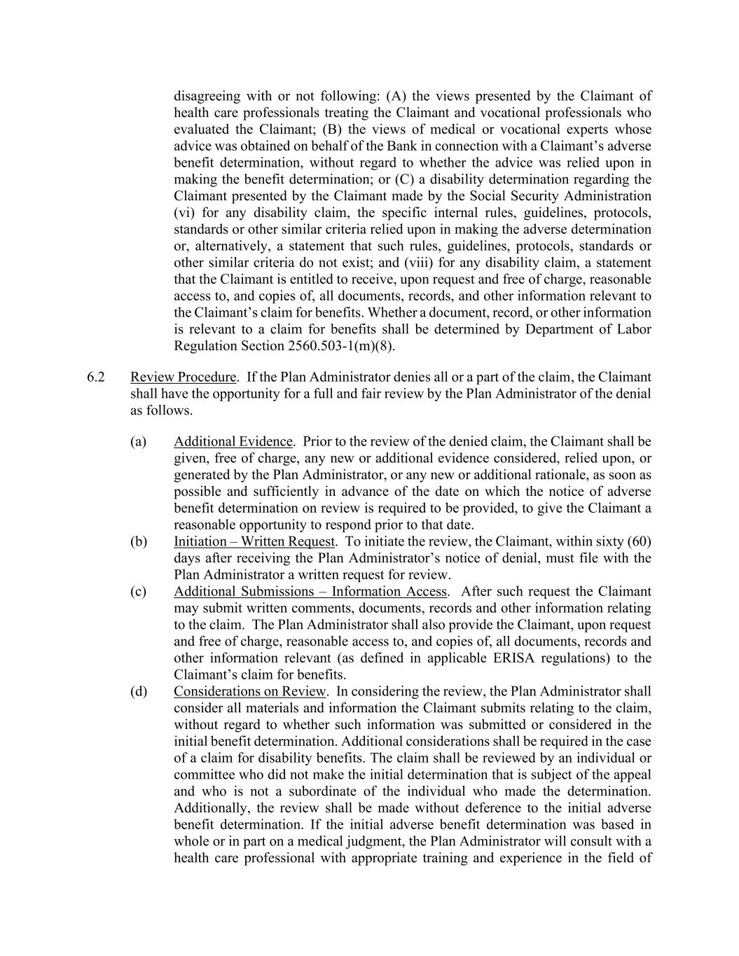 disagreeing with or not following: (A) the views presented by the Claimant of health care professionals treating the Claimant and vocational professionals who evaluated the Claimant; (B) the views of medical or vocational experts whose advice was obtained on behalf of the Bank in connection with a Claimant’s adverse benefit determination, without regard to whether the advice was relied upon in making the benefit determination; or (C) a disability determination regarding the Claimant presented by the Claimant made by the Social Security Administration (vi) for any disability claim, the specific internal rules, guidelines, protocols, standards or other similar criteria relied upon in making the adverse determination or, alternatively, a statement that such rules, guidelines, protocols, standards or other similar criteria do not exist; and (viii) for any disability claim, a statement that the Claimant is entitled to receive, upon request and free of charge, reasonable access to, and copies of, all documents, records, and other information relevant to the Claimant’s claim for benefits. Whether a document, record, or other information is relevant to a claim for benefits shall be determined by Department of Labor Regulation Section 2560.503-1(m)(8). 6.2 Review Procedure. If the Plan Administrator denies all or a part of the claim, the Claimant shall have the opportunity for a full and fair review by the Plan Administrator of the denial as follows. (a) Additional Evidence. Prior to the review of the denied claim, the Claimant shall be given, free of charge, any new or additional evidence considered, relied upon, or generated by the Plan Administrator, or any new or additional rationale, as soon as possible and sufficiently in advance of the date on which the notice of adverse benefit determination on review is required to be provided, to give the Claimant a reasonable opportunity to respond prior to that date. (b) Initiation – Written Request. To initiate the review, the Claimant, within sixty (60) days after receiving the Plan Administrator’s notice of denial, must file with the Plan Administrator a written request for review. (c) Additional Submissions – Information Access. After such request the Claimant may submit written comments, documents, records and other information relating to the claim. The Plan Administrator shall also provide the Claimant, upon request and free of charge, reasonable access to, and copies of, all documents, records and other information relevant (as defined in applicable ERISA regulations) to the Claimant’s claim for benefits. (d) Considerations on Review. In considering the review, the Plan Administrator shall consider all materials and information the Claimant submits relating to the claim, without regard to whether such information was submitted or considered in the initial benefit determination. Additional considerations shall be required in the case of a claim for disability benefits. The claim shall be reviewed by an individual or committee who did not make the initial determination that is subject of the appeal and who is not a subordinate of the individual who made the determination. Additionally, the review shall be made without deference to the initial adverse benefit determination. If the initial adverse benefit determination was based in whole or in part on a medical judgment, the Plan Administrator will consult with a health care professional with appropriate training and experience in the field of