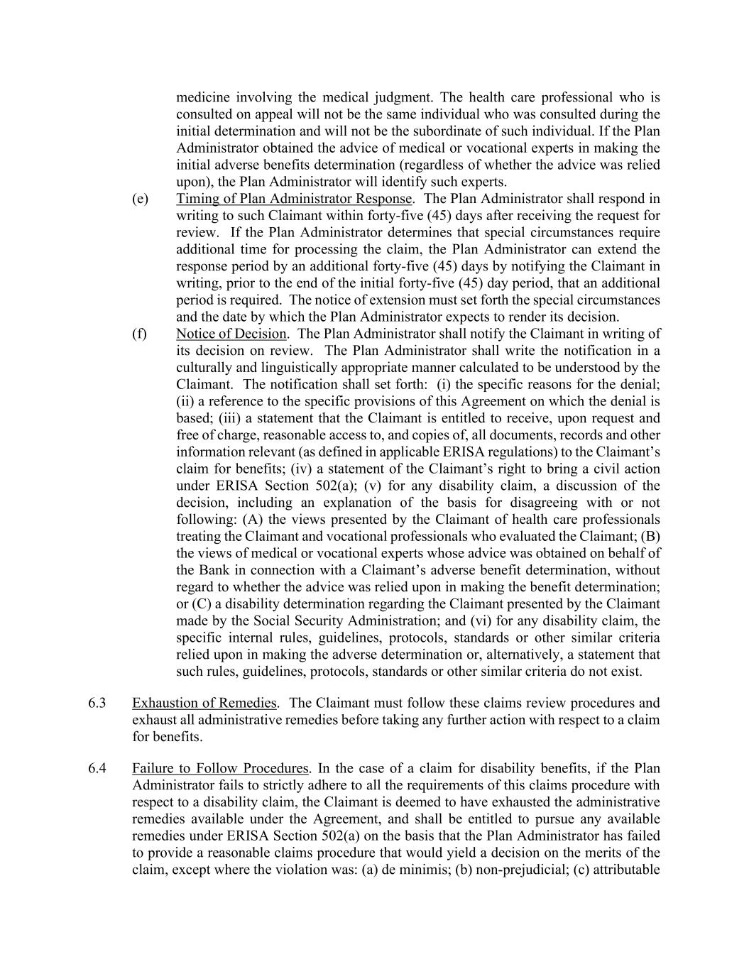 medicine involving the medical judgment. The health care professional who is consulted on appeal will not be the same individual who was consulted during the initial determination and will not be the subordinate of such individual. If the Plan Administrator obtained the advice of medical or vocational experts in making the initial adverse benefits determination (regardless of whether the advice was relied upon), the Plan Administrator will identify such experts. (e) Timing of Plan Administrator Response. The Plan Administrator shall respond in writing to such Claimant within forty-five (45) days after receiving the request for review. If the Plan Administrator determines that special circumstances require additional time for processing the claim, the Plan Administrator can extend the response period by an additional forty-five (45) days by notifying the Claimant in writing, prior to the end of the initial forty-five (45) day period, that an additional period is required. The notice of extension must set forth the special circumstances and the date by which the Plan Administrator expects to render its decision. (f) Notice of Decision. The Plan Administrator shall notify the Claimant in writing of its decision on review. The Plan Administrator shall write the notification in a culturally and linguistically appropriate manner calculated to be understood by the Claimant. The notification shall set forth: (i) the specific reasons for the denial; (ii) a reference to the specific provisions of this Agreement on which the denial is based; (iii) a statement that the Claimant is entitled to receive, upon request and free of charge, reasonable access to, and copies of, all documents, records and other information relevant (as defined in applicable ERISA regulations) to the Claimant’s claim for benefits; (iv) a statement of the Claimant’s right to bring a civil action under ERISA Section 502(a); (v) for any disability claim, a discussion of the decision, including an explanation of the basis for disagreeing with or not following: (A) the views presented by the Claimant of health care professionals treating the Claimant and vocational professionals who evaluated the Claimant; (B) the views of medical or vocational experts whose advice was obtained on behalf of the Bank in connection with a Claimant’s adverse benefit determination, without regard to whether the advice was relied upon in making the benefit determination; or (C) a disability determination regarding the Claimant presented by the Claimant made by the Social Security Administration; and (vi) for any disability claim, the specific internal rules, guidelines, protocols, standards or other similar criteria relied upon in making the adverse determination or, alternatively, a statement that such rules, guidelines, protocols, standards or other similar criteria do not exist. 6.3 Exhaustion of Remedies. The Claimant must follow these claims review procedures and exhaust all administrative remedies before taking any further action with respect to a claim for benefits. 6.4 Failure to Follow Procedures. In the case of a claim for disability benefits, if the Plan Administrator fails to strictly adhere to all the requirements of this claims procedure with respect to a disability claim, the Claimant is deemed to have exhausted the administrative remedies available under the Agreement, and shall be entitled to pursue any available remedies under ERISA Section 502(a) on the basis that the Plan Administrator has failed to provide a reasonable claims procedure that would yield a decision on the merits of the claim, except where the violation was: (a) de minimis; (b) non-prejudicial; (c) attributable