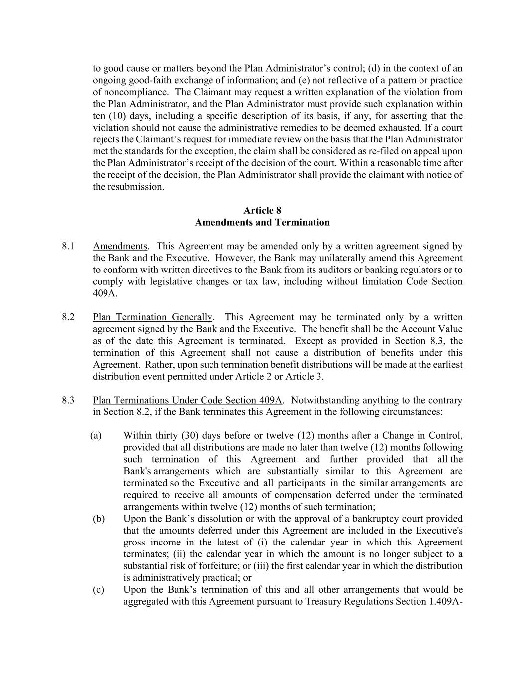 to good cause or matters beyond the Plan Administrator’s control; (d) in the context of an ongoing good-faith exchange of information; and (e) not reflective of a pattern or practice of noncompliance. The Claimant may request a written explanation of the violation from the Plan Administrator, and the Plan Administrator must provide such explanation within ten (10) days, including a specific description of its basis, if any, for asserting that the violation should not cause the administrative remedies to be deemed exhausted. If a court rejects the Claimant’s request for immediate review on the basis that the Plan Administrator met the standards for the exception, the claim shall be considered as re-filed on appeal upon the Plan Administrator’s receipt of the decision of the court. Within a reasonable time after the receipt of the decision, the Plan Administrator shall provide the claimant with notice of the resubmission. Article 8 Amendments and Termination 8.1 Amendments. This Agreement may be amended only by a written agreement signed by the Bank and the Executive. However, the Bank may unilaterally amend this Agreement to conform with written directives to the Bank from its auditors or banking regulators or to comply with legislative changes or tax law, including without limitation Code Section 409A. 8.2 Plan Termination Generally. This Agreement may be terminated only by a written agreement signed by the Bank and the Executive. The benefit shall be the Account Value as of the date this Agreement is terminated. Except as provided in Section 8.3, the termination of this Agreement shall not cause a distribution of benefits under this Agreement. Rather, upon such termination benefit distributions will be made at the earliest distribution event permitted under Article 2 or Article 3. 8.3 Plan Terminations Under Code Section 409A. Notwithstanding anything to the contrary in Section 8.2, if the Bank terminates this Agreement in the following circumstances: (a) Within thirty (30) days before or twelve (12) months after a Change in Control, provided that all distributions are made no later than twelve (12) months following such termination of this Agreement and further provided that all the Bank's arrangements which are substantially similar to this Agreement are terminated so the Executive and all participants in the similar arrangements are required to receive all amounts of compensation deferred under the terminated arrangements within twelve (12) months of such termination; (b) Upon the Bank’s dissolution or with the approval of a bankruptcy court provided that the amounts deferred under this Agreement are included in the Executive's gross income in the latest of (i) the calendar year in which this Agreement terminates; (ii) the calendar year in which the amount is no longer subject to a substantial risk of forfeiture; or (iii) the first calendar year in which the distribution is administratively practical; or (c) Upon the Bank’s termination of this and all other arrangements that would be aggregated with this Agreement pursuant to Treasury Regulations Section 1.409A-
