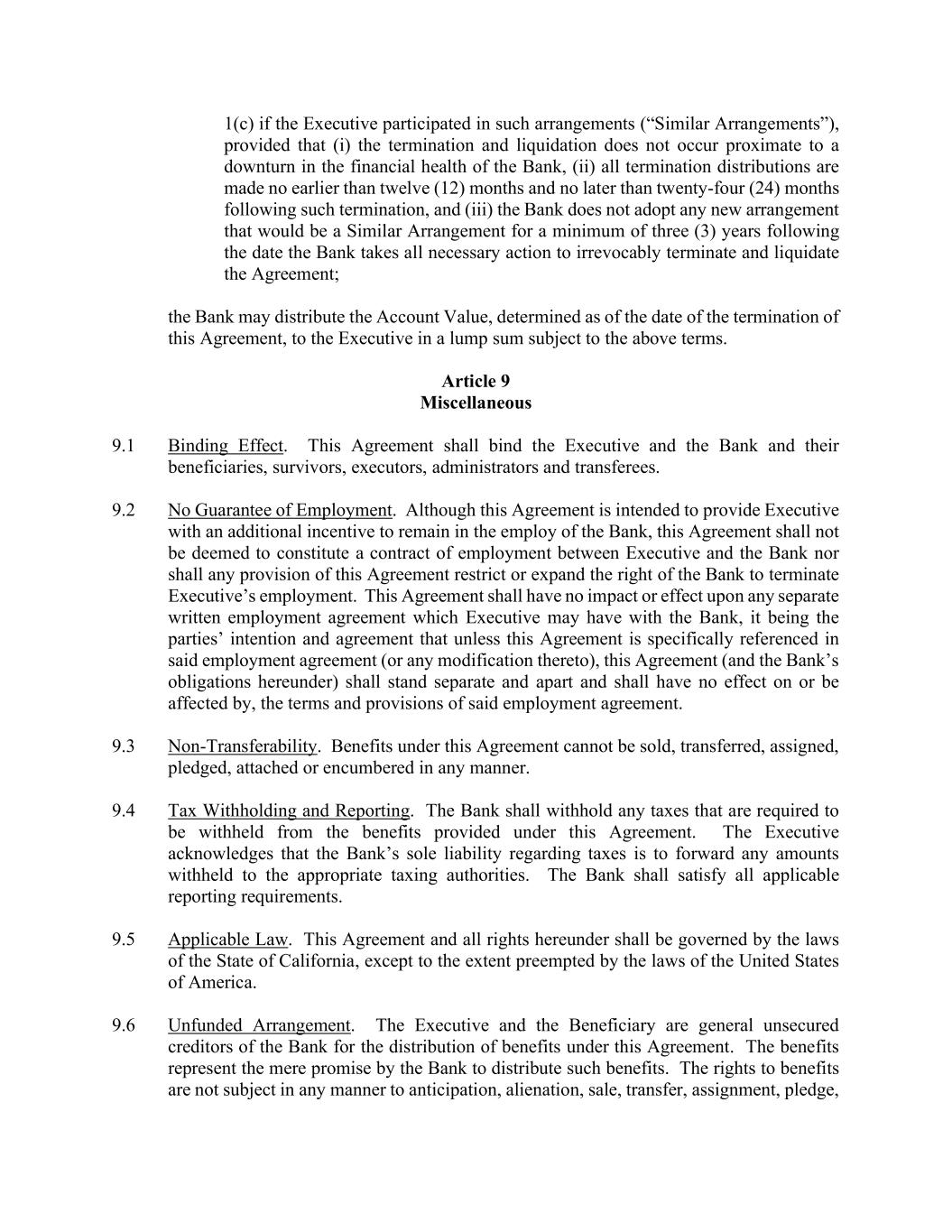 1(c) if the Executive participated in such arrangements (“Similar Arrangements”), provided that (i) the termination and liquidation does not occur proximate to a downturn in the financial health of the Bank, (ii) all termination distributions are made no earlier than twelve (12) months and no later than twenty-four (24) months following such termination, and (iii) the Bank does not adopt any new arrangement that would be a Similar Arrangement for a minimum of three (3) years following the date the Bank takes all necessary action to irrevocably terminate and liquidate the Agreement; the Bank may distribute the Account Value, determined as of the date of the termination of this Agreement, to the Executive in a lump sum subject to the above terms. Article 9 Miscellaneous 9.1 Binding Effect. This Agreement shall bind the Executive and the Bank and their beneficiaries, survivors, executors, administrators and transferees. 9.2 No Guarantee of Employment. Although this Agreement is intended to provide Executive with an additional incentive to remain in the employ of the Bank, this Agreement shall not be deemed to constitute a contract of employment between Executive and the Bank nor shall any provision of this Agreement restrict or expand the right of the Bank to terminate Executive’s employment. This Agreement shall have no impact or effect upon any separate written employment agreement which Executive may have with the Bank, it being the parties’ intention and agreement that unless this Agreement is specifically referenced in said employment agreement (or any modification thereto), this Agreement (and the Bank’s obligations hereunder) shall stand separate and apart and shall have no effect on or be affected by, the terms and provisions of said employment agreement. 9.3 Non-Transferability. Benefits under this Agreement cannot be sold, transferred, assigned, pledged, attached or encumbered in any manner. 9.4 Tax Withholding and Reporting. The Bank shall withhold any taxes that are required to be withheld from the benefits provided under this Agreement. The Executive acknowledges that the Bank’s sole liability regarding taxes is to forward any amounts withheld to the appropriate taxing authorities. The Bank shall satisfy all applicable reporting requirements. 9.5 Applicable Law. This Agreement and all rights hereunder shall be governed by the laws of the State of California, except to the extent preempted by the laws of the United States of America. 9.6 Unfunded Arrangement. The Executive and the Beneficiary are general unsecured creditors of the Bank for the distribution of benefits under this Agreement. The benefits represent the mere promise by the Bank to distribute such benefits. The rights to benefits are not subject in any manner to anticipation, alienation, sale, transfer, assignment, pledge,