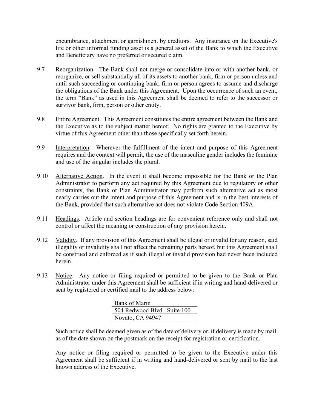 encumbrance, attachment or garnishment by creditors. Any insurance on the Executive's life or other informal funding asset is a general asset of the Bank to which the Executive and Beneficiary have no preferred or secured claim. 9.7 Reorganization. The Bank shall not merge or consolidate into or with another bank, or reorganize, or sell substantially all of its assets to another bank, firm or person unless and until such succeeding or continuing bank, firm or person agrees to assume and discharge the obligations of the Bank under this Agreement. Upon the occurrence of such an event, the term “Bank” as used in this Agreement shall be deemed to refer to the successor or survivor bank, firm, person or other entity. 9.8 Entire Agreement. This Agreement constitutes the entire agreement between the Bank and the Executive as to the subject matter hereof. No rights are granted to the Executive by virtue of this Agreement other than those specifically set forth herein. 9.9 Interpretation. Wherever the fulfillment of the intent and purpose of this Agreement requires and the context will permit, the use of the masculine gender includes the feminine and use of the singular includes the plural. 9.10 Alternative Action. In the event it shall become impossible for the Bank or the Plan Administrator to perform any act required by this Agreement due to regulatory or other constraints, the Bank or Plan Administrator may perform such alternative act as most nearly carries out the intent and purpose of this Agreement and is in the best interests of the Bank, provided that such alternative act does not violate Code Section 409A. 9.11 Headings. Article and section headings are for convenient reference only and shall not control or affect the meaning or construction of any provision herein. 9.12 Validity. If any provision of this Agreement shall be illegal or invalid for any reason, said illegality or invalidity shall not affect the remaining parts hereof, but this Agreement shall be construed and enforced as if such illegal or invalid provision had never been included herein. 9.13 Notice. Any notice or filing required or permitted to be given to the Bank or Plan Administrator under this Agreement shall be sufficient if in writing and hand-delivered or sent by registered or certified mail to the address below: Bank of Marin 504 Redwood Blvd., Suite 100 Novato, CA 94947 Such notice shall be deemed given as of the date of delivery or, if delivery is made by mail, as of the date shown on the postmark on the receipt for registration or certification. Any notice or filing required or permitted to be given to the Executive under this Agreement shall be sufficient if in writing and hand-delivered or sent by mail to the last known address of the Executive.