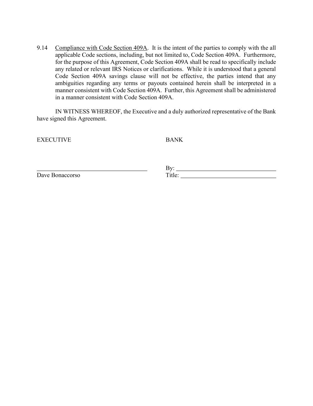 9.14 Compliance with Code Section 409A. It is the intent of the parties to comply with the all applicable Code sections, including, but not limited to, Code Section 409A. Furthermore, for the purpose of this Agreement, Code Section 409A shall be read to specifically include any related or relevant IRS Notices or clarifications. While it is understood that a general Code Section 409A savings clause will not be effective, the parties intend that any ambiguities regarding any terms or payouts contained herein shall be interpreted in a manner consistent with Code Section 409A. Further, this Agreement shall be administered in a manner consistent with Code Section 409A. IN WITNESS WHEREOF, the Executive and a duly authorized representative of the Bank have signed this Agreement. EXECUTIVE BANK By: Dave Bonaccorso Title: