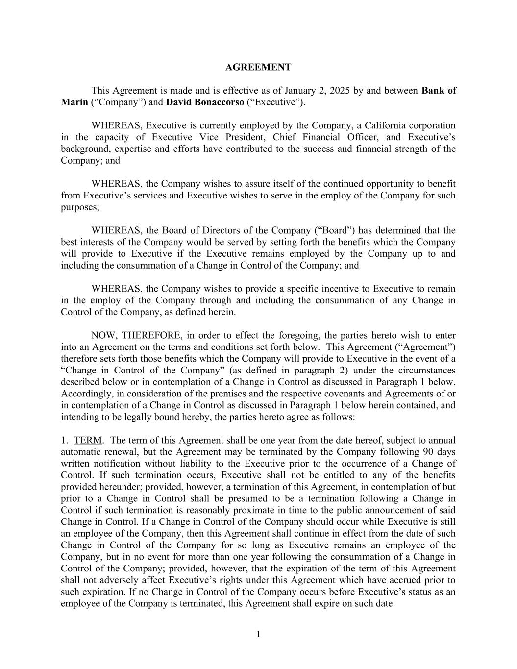 1 AGREEMENT This Agreement is made and is effective as of January 2, 2025 by and between Bank of Marin (“Company”) and David Bonaccorso (“Executive”). WHEREAS, Executive is currently employed by the Company, a California corporation in the capacity of Executive Vice President, Chief Financial Officer, and Executive’s background, expertise and efforts have contributed to the success and financial strength of the Company; and WHEREAS, the Company wishes to assure itself of the continued opportunity to benefit from Executive’s services and Executive wishes to serve in the employ of the Company for such purposes; WHEREAS, the Board of Directors of the Company (“Board”) has determined that the best interests of the Company would be served by setting forth the benefits which the Company will provide to Executive if the Executive remains employed by the Company up to and including the consummation of a Change in Control of the Company; and WHEREAS, the Company wishes to provide a specific incentive to Executive to remain in the employ of the Company through and including the consummation of any Change in Control of the Company, as defined herein. NOW, THEREFORE, in order to effect the foregoing, the parties hereto wish to enter into an Agreement on the terms and conditions set forth below. This Agreement (“Agreement”) therefore sets forth those benefits which the Company will provide to Executive in the event of a “Change in Control of the Company” (as defined in paragraph 2) under the circumstances described below or in contemplation of a Change in Control as discussed in Paragraph 1 below. Accordingly, in consideration of the premises and the respective covenants and Agreements of or in contemplation of a Change in Control as discussed in Paragraph 1 below herein contained, and intending to be legally bound hereby, the parties hereto agree as follows: 1. TERM. The term of this Agreement shall be one year from the date hereof, subject to annual automatic renewal, but the Agreement may be terminated by the Company following 90 days written notification without liability to the Executive prior to the occurrence of a Change of Control. If such termination occurs, Executive shall not be entitled to any of the benefits provided hereunder; provided, however, a termination of this Agreement, in contemplation of but prior to a Change in Control shall be presumed to be a termination following a Change in Control if such termination is reasonably proximate in time to the public announcement of said Change in Control. If a Change in Control of the Company should occur while Executive is still an employee of the Company, then this Agreement shall continue in effect from the date of such Change in Control of the Company for so long as Executive remains an employee of the Company, but in no event for more than one year following the consummation of a Change in Control of the Company; provided, however, that the expiration of the term of this Agreement shall not adversely affect Executive’s rights under this Agreement which have accrued prior to such expiration. If no Change in Control of the Company occurs before Executive’s status as an employee of the Company is terminated, this Agreement shall expire on such date.