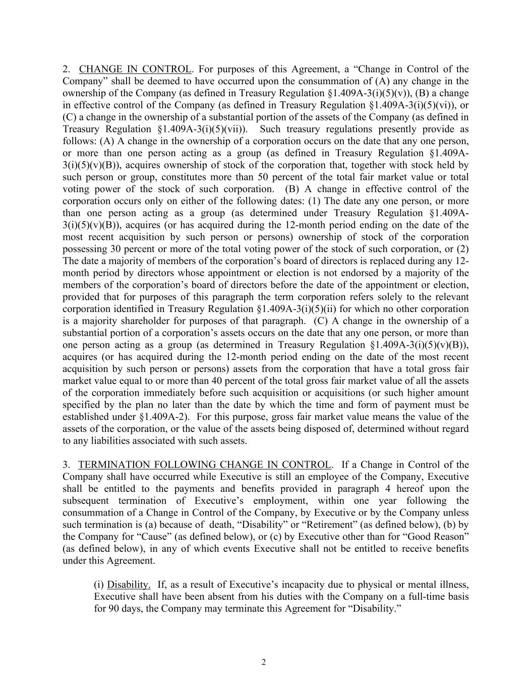 2 2. CHANGE IN CONTROL. For purposes of this Agreement, a “Change in Control of the Company” shall be deemed to have occurred upon the consummation of (A) any change in the ownership of the Company (as defined in Treasury Regulation §1.409A-3(i)(5)(v)), (B) a change in effective control of the Company (as defined in Treasury Regulation §1.409A-3(i)(5)(vi)), or (C) a change in the ownership of a substantial portion of the assets of the Company (as defined in Treasury Regulation §1.409A-3(i)(5)(vii)). Such treasury regulations presently provide as follows: (A) A change in the ownership of a corporation occurs on the date that any one person, or more than one person acting as a group (as defined in Treasury Regulation §1.409A- 3(i)(5)(v)(B)), acquires ownership of stock of the corporation that, together with stock held by such person or group, constitutes more than 50 percent of the total fair market value or total voting power of the stock of such corporation. (B) A change in effective control of the corporation occurs only on either of the following dates: (1) The date any one person, or more than one person acting as a group (as determined under Treasury Regulation §1.409A- 3(i)(5)(v)(B)), acquires (or has acquired during the 12-month period ending on the date of the most recent acquisition by such person or persons) ownership of stock of the corporation possessing 30 percent or more of the total voting power of the stock of such corporation, or (2) The date a majority of members of the corporation’s board of directors is replaced during any 12- month period by directors whose appointment or election is not endorsed by a majority of the members of the corporation’s board of directors before the date of the appointment or election, provided that for purposes of this paragraph the term corporation refers solely to the relevant corporation identified in Treasury Regulation §1.409A-3(i)(5)(ii) for which no other corporation is a majority shareholder for purposes of that paragraph. (C) A change in the ownership of a substantial portion of a corporation’s assets occurs on the date that any one person, or more than one person acting as a group (as determined in Treasury Regulation §1.409A-3(i)(5)(v)(B)), acquires (or has acquired during the 12-month period ending on the date of the most recent acquisition by such person or persons) assets from the corporation that have a total gross fair market value equal to or more than 40 percent of the total gross fair market value of all the assets of the corporation immediately before such acquisition or acquisitions (or such higher amount specified by the plan no later than the date by which the time and form of payment must be established under §1.409A-2). For this purpose, gross fair market value means the value of the assets of the corporation, or the value of the assets being disposed of, determined without regard to any liabilities associated with such assets. 3. TERMINATION FOLLOWING CHANGE IN CONTROL. If a Change in Control of the Company shall have occurred while Executive is still an employee of the Company, Executive shall be entitled to the payments and benefits provided in paragraph 4 hereof upon the subsequent termination of Executive’s employment, within one year following the consummation of a Change in Control of the Company, by Executive or by the Company unless such termination is (a) because of death, “Disability” or “Retirement” (as defined below), (b) by the Company for “Cause” (as defined below), or (c) by Executive other than for “Good Reason” (as defined below), in any of which events Executive shall not be entitled to receive benefits under this Agreement. (i) Disability. If, as a result of Executive’s incapacity due to physical or mental illness, Executive shall have been absent from his duties with the Company on a full-time basis for 90 days, the Company may terminate this Agreement for “Disability.”