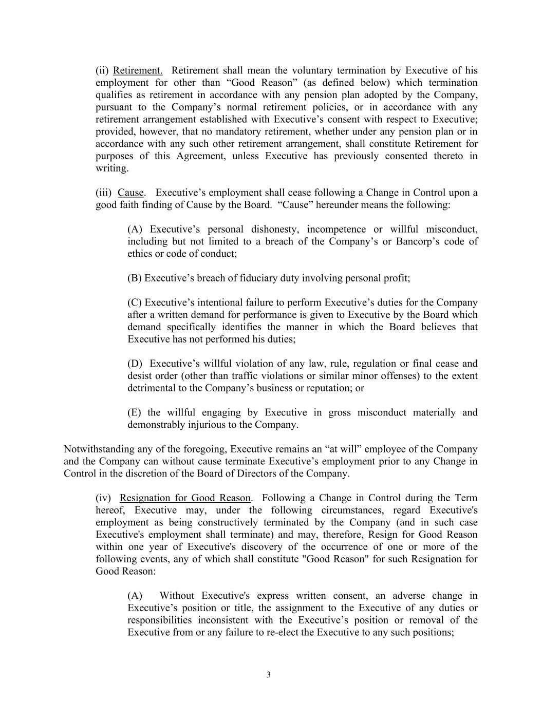 3 (ii) Retirement. Retirement shall mean the voluntary termination by Executive of his employment for other than “Good Reason” (as defined below) which termination qualifies as retirement in accordance with any pension plan adopted by the Company, pursuant to the Company’s normal retirement policies, or in accordance with any retirement arrangement established with Executive’s consent with respect to Executive; provided, however, that no mandatory retirement, whether under any pension plan or in accordance with any such other retirement arrangement, shall constitute Retirement for purposes of this Agreement, unless Executive has previously consented thereto in writing. (iii) Cause. Executive’s employment shall cease following a Change in Control upon a good faith finding of Cause by the Board. “Cause” hereunder means the following: (A) Executive’s personal dishonesty, incompetence or willful misconduct, including but not limited to a breach of the Company’s or Bancorp’s code of ethics or code of conduct; (B) Executive’s breach of fiduciary duty involving personal profit; (C) Executive’s intentional failure to perform Executive’s duties for the Company after a written demand for performance is given to Executive by the Board which demand specifically identifies the manner in which the Board believes that Executive has not performed his duties; (D) Executive’s willful violation of any law, rule, regulation or final cease and desist order (other than traffic violations or similar minor offenses) to the extent detrimental to the Company’s business or reputation; or (E) the willful engaging by Executive in gross misconduct materially and demonstrably injurious to the Company. Notwithstanding any of the foregoing, Executive remains an “at will” employee of the Company and the Company can without cause terminate Executive’s employment prior to any Change in Control in the discretion of the Board of Directors of the Company. (iv) Resignation for Good Reason. Following a Change in Control during the Term hereof, Executive may, under the following circumstances, regard Executive's employment as being constructively terminated by the Company (and in such case Executive's employment shall terminate) and may, therefore, Resign for Good Reason within one year of Executive's discovery of the occurrence of one or more of the following events, any of which shall constitute "Good Reason" for such Resignation for Good Reason: (A) Without Executive's express written consent, an adverse change in Executive’s position or title, the assignment to the Executive of any duties or responsibilities inconsistent with the Executive’s position or removal of the Executive from or any failure to re-elect the Executive to any such positions;