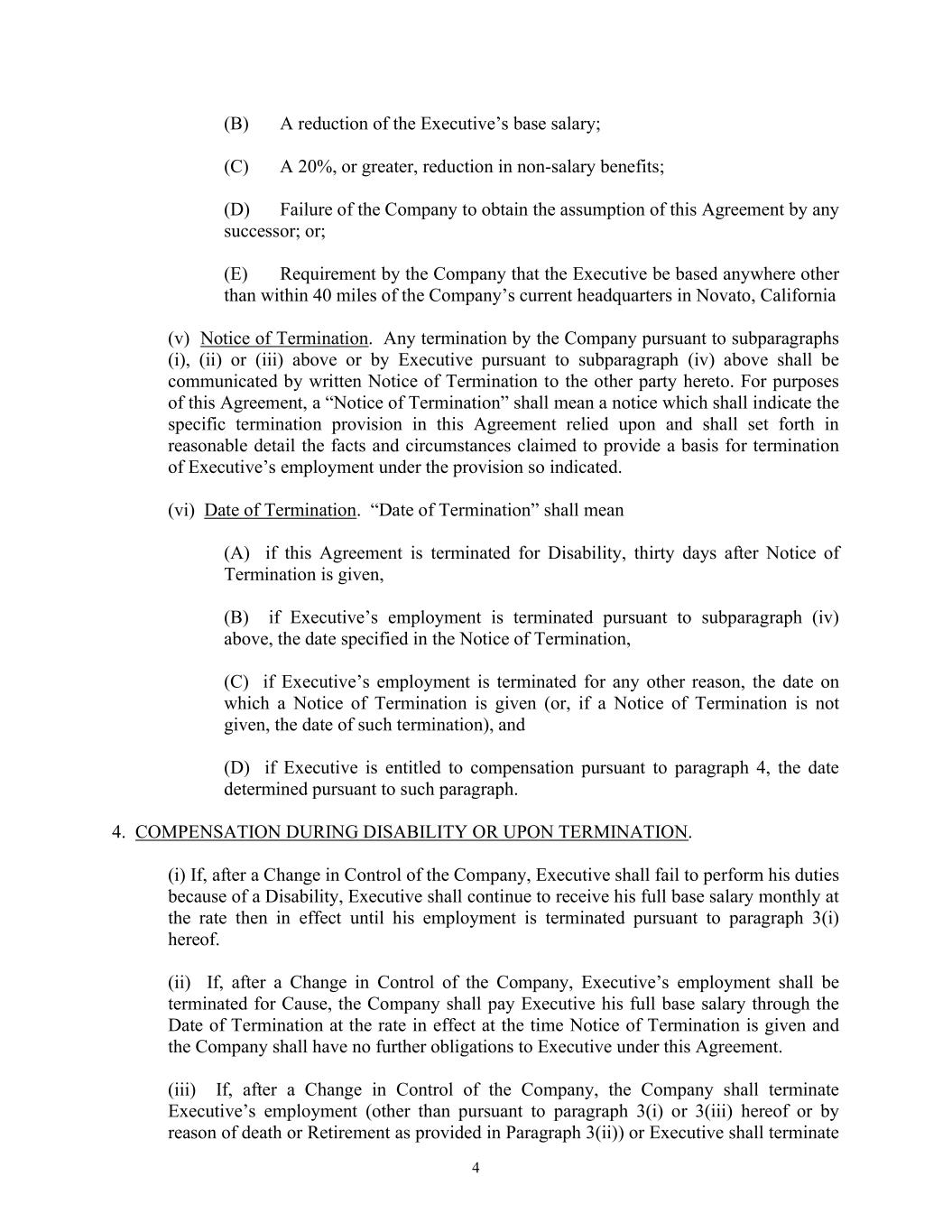 4 (B) A reduction of the Executive’s base salary; (C) A 20%, or greater, reduction in non-salary benefits; (D) Failure of the Company to obtain the assumption of this Agreement by any successor; or; (E) Requirement by the Company that the Executive be based anywhere other than within 40 miles of the Company’s current headquarters in Novato, California (v) Notice of Termination. Any termination by the Company pursuant to subparagraphs (i), (ii) or (iii) above or by Executive pursuant to subparagraph (iv) above shall be communicated by written Notice of Termination to the other party hereto. For purposes of this Agreement, a “Notice of Termination” shall mean a notice which shall indicate the specific termination provision in this Agreement relied upon and shall set forth in reasonable detail the facts and circumstances claimed to provide a basis for termination of Executive’s employment under the provision so indicated. (vi) Date of Termination. “Date of Termination” shall mean (A) if this Agreement is terminated for Disability, thirty days after Notice of Termination is given, (B) if Executive’s employment is terminated pursuant to subparagraph (iv) above, the date specified in the Notice of Termination, (C) if Executive’s employment is terminated for any other reason, the date on which a Notice of Termination is given (or, if a Notice of Termination is not given, the date of such termination), and (D) if Executive is entitled to compensation pursuant to paragraph 4, the date determined pursuant to such paragraph. 4. COMPENSATION DURING DISABILITY OR UPON TERMINATION. (i) If, after a Change in Control of the Company, Executive shall fail to perform his duties because of a Disability, Executive shall continue to receive his full base salary monthly at the rate then in effect until his employment is terminated pursuant to paragraph 3(i) hereof. (ii) If, after a Change in Control of the Company, Executive’s employment shall be terminated for Cause, the Company shall pay Executive his full base salary through the Date of Termination at the rate in effect at the time Notice of Termination is given and the Company shall have no further obligations to Executive under this Agreement. (iii) If, after a Change in Control of the Company, the Company shall terminate Executive’s employment (other than pursuant to paragraph 3(i) or 3(iii) hereof or by reason of death or Retirement as provided in Paragraph 3(ii)) or Executive shall terminate