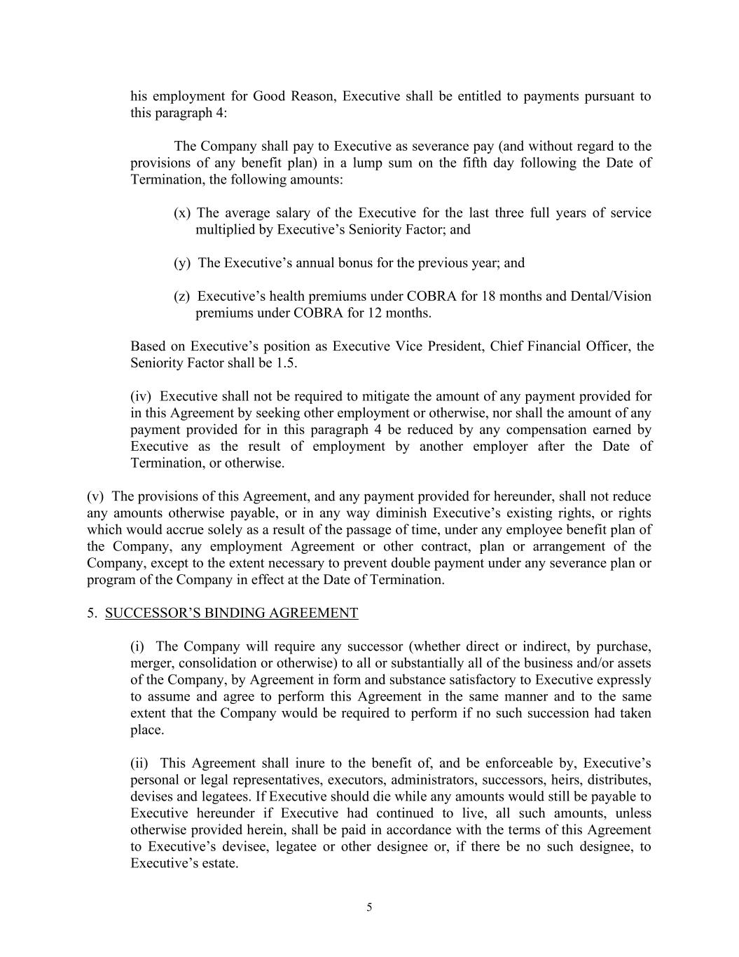 5 his employment for Good Reason, Executive shall be entitled to payments pursuant to this paragraph 4: The Company shall pay to Executive as severance pay (and without regard to the provisions of any benefit plan) in a lump sum on the fifth day following the Date of Termination, the following amounts: (x) The average salary of the Executive for the last three full years of service multiplied by Executive’s Seniority Factor; and (y) The Executive’s annual bonus for the previous year; and (z) Executive’s health premiums under COBRA for 18 months and Dental/Vision premiums under COBRA for 12 months. Based on Executive’s position as Executive Vice President, Chief Financial Officer, the Seniority Factor shall be 1.5. (iv) Executive shall not be required to mitigate the amount of any payment provided for in this Agreement by seeking other employment or otherwise, nor shall the amount of any payment provided for in this paragraph 4 be reduced by any compensation earned by Executive as the result of employment by another employer after the Date of Termination, or otherwise. (v) The provisions of this Agreement, and any payment provided for hereunder, shall not reduce any amounts otherwise payable, or in any way diminish Executive’s existing rights, or rights which would accrue solely as a result of the passage of time, under any employee benefit plan of the Company, any employment Agreement or other contract, plan or arrangement of the Company, except to the extent necessary to prevent double payment under any severance plan or program of the Company in effect at the Date of Termination. 5. SUCCESSOR’S BINDING AGREEMENT (i) The Company will require any successor (whether direct or indirect, by purchase, merger, consolidation or otherwise) to all or substantially all of the business and/or assets of the Company, by Agreement in form and substance satisfactory to Executive expressly to assume and agree to perform this Agreement in the same manner and to the same extent that the Company would be required to perform if no such succession had taken place. (ii) This Agreement shall inure to the benefit of, and be enforceable by, Executive’s personal or legal representatives, executors, administrators, successors, heirs, distributes, devises and legatees. If Executive should die while any amounts would still be payable to Executive hereunder if Executive had continued to live, all such amounts, unless otherwise provided herein, shall be paid in accordance with the terms of this Agreement to Executive’s devisee, legatee or other designee or, if there be no such designee, to Executive’s estate.