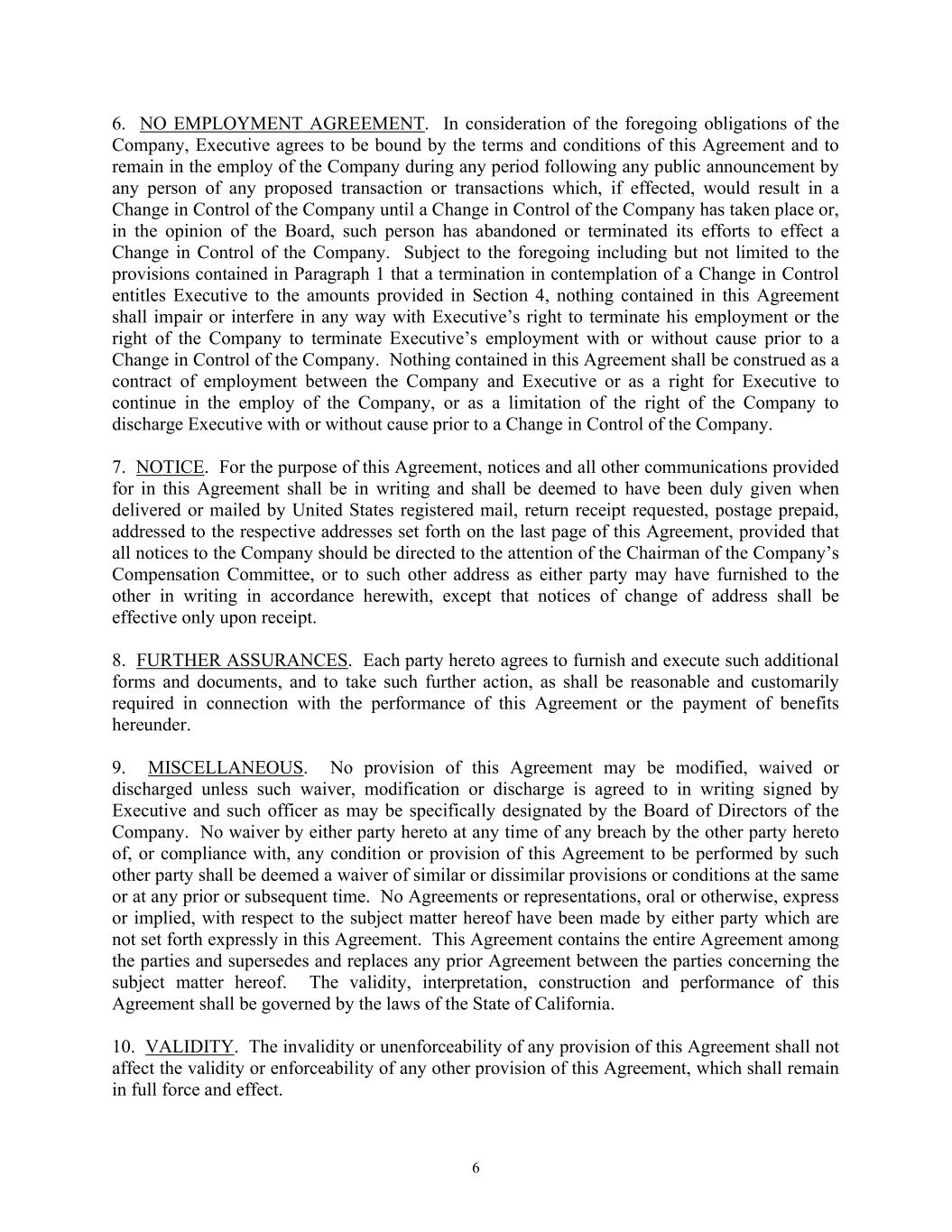 6 6. NO EMPLOYMENT AGREEMENT. In consideration of the foregoing obligations of the Company, Executive agrees to be bound by the terms and conditions of this Agreement and to remain in the employ of the Company during any period following any public announcement by any person of any proposed transaction or transactions which, if effected, would result in a Change in Control of the Company until a Change in Control of the Company has taken place or, in the opinion of the Board, such person has abandoned or terminated its efforts to effect a Change in Control of the Company. Subject to the foregoing including but not limited to the provisions contained in Paragraph 1 that a termination in contemplation of a Change in Control entitles Executive to the amounts provided in Section 4, nothing contained in this Agreement shall impair or interfere in any way with Executive’s right to terminate his employment or the right of the Company to terminate Executive’s employment with or without cause prior to a Change in Control of the Company. Nothing contained in this Agreement shall be construed as a contract of employment between the Company and Executive or as a right for Executive to continue in the employ of the Company, or as a limitation of the right of the Company to discharge Executive with or without cause prior to a Change in Control of the Company. 7. NOTICE. For the purpose of this Agreement, notices and all other communications provided for in this Agreement shall be in writing and shall be deemed to have been duly given when delivered or mailed by United States registered mail, return receipt requested, postage prepaid, addressed to the respective addresses set forth on the last page of this Agreement, provided that all notices to the Company should be directed to the attention of the Chairman of the Company’s Compensation Committee, or to such other address as either party may have furnished to the other in writing in accordance herewith, except that notices of change of address shall be effective only upon receipt. 8. FURTHER ASSURANCES. Each party hereto agrees to furnish and execute such additional forms and documents, and to take such further action, as shall be reasonable and customarily required in connection with the performance of this Agreement or the payment of benefits hereunder. 9. MISCELLANEOUS. No provision of this Agreement may be modified, waived or discharged unless such waiver, modification or discharge is agreed to in writing signed by Executive and such officer as may be specifically designated by the Board of Directors of the Company. No waiver by either party hereto at any time of any breach by the other party hereto of, or compliance with, any condition or provision of this Agreement to be performed by such other party shall be deemed a waiver of similar or dissimilar provisions or conditions at the same or at any prior or subsequent time. No Agreements or representations, oral or otherwise, express or implied, with respect to the subject matter hereof have been made by either party which are not set forth expressly in this Agreement. This Agreement contains the entire Agreement among the parties and supersedes and replaces any prior Agreement between the parties concerning the subject matter hereof. The validity, interpretation, construction and performance of this Agreement shall be governed by the laws of the State of California. 10. VALIDITY. The invalidity or unenforceability of any provision of this Agreement shall not affect the validity or enforceability of any other provision of this Agreement, which shall remain in full force and effect.