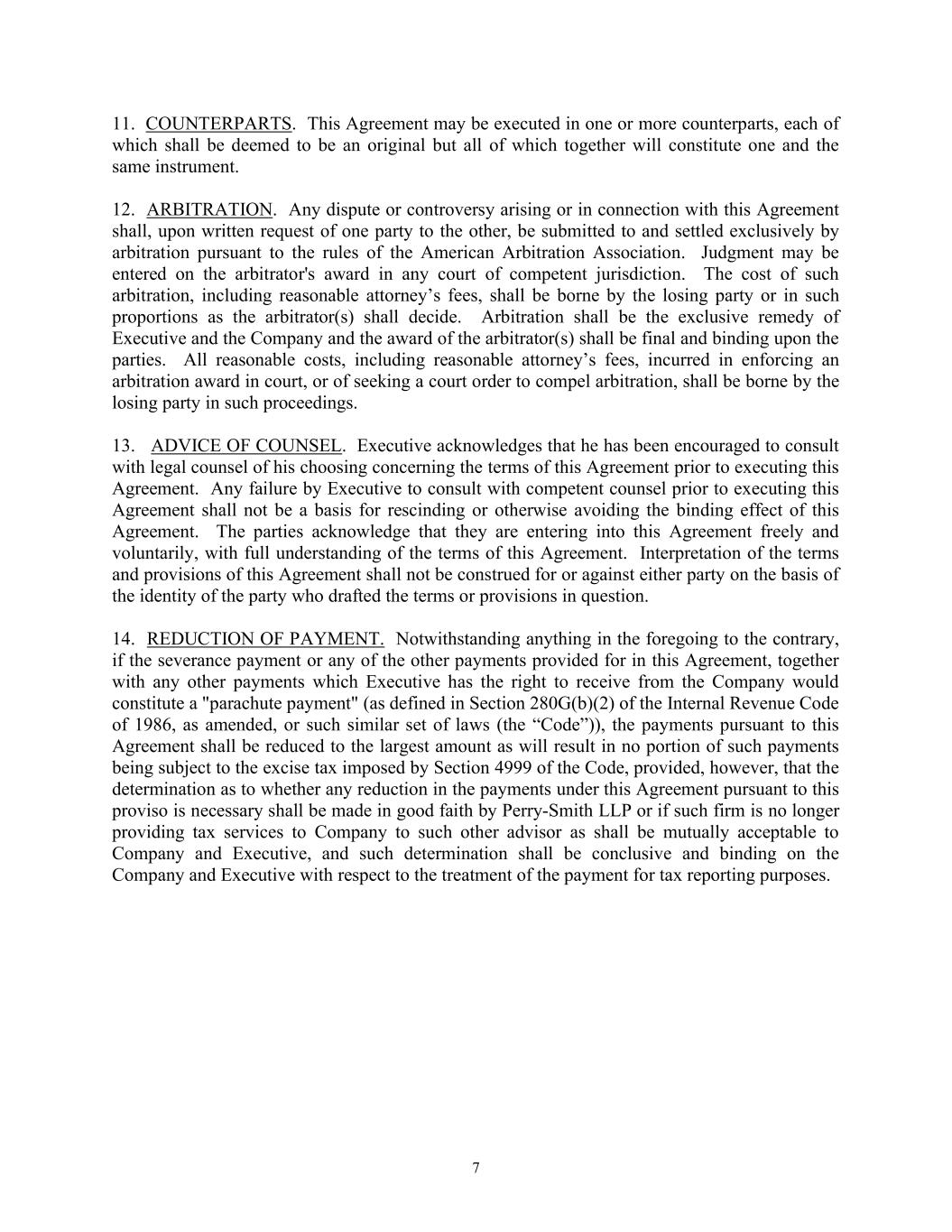 7 11. COUNTERPARTS. This Agreement may be executed in one or more counterparts, each of which shall be deemed to be an original but all of which together will constitute one and the same instrument. 12. ARBITRATION. Any dispute or controversy arising or in connection with this Agreement shall, upon written request of one party to the other, be submitted to and settled exclusively by arbitration pursuant to the rules of the American Arbitration Association. Judgment may be entered on the arbitrator's award in any court of competent jurisdiction. The cost of such arbitration, including reasonable attorney’s fees, shall be borne by the losing party or in such proportions as the arbitrator(s) shall decide. Arbitration shall be the exclusive remedy of Executive and the Company and the award of the arbitrator(s) shall be final and binding upon the parties. All reasonable costs, including reasonable attorney’s fees, incurred in enforcing an arbitration award in court, or of seeking a court order to compel arbitration, shall be borne by the losing party in such proceedings. 13. ADVICE OF COUNSEL. Executive acknowledges that he has been encouraged to consult with legal counsel of his choosing concerning the terms of this Agreement prior to executing this Agreement. Any failure by Executive to consult with competent counsel prior to executing this Agreement shall not be a basis for rescinding or otherwise avoiding the binding effect of this Agreement. The parties acknowledge that they are entering into this Agreement freely and voluntarily, with full understanding of the terms of this Agreement. Interpretation of the terms and provisions of this Agreement shall not be construed for or against either party on the basis of the identity of the party who drafted the terms or provisions in question. 14. REDUCTION OF PAYMENT. Notwithstanding anything in the foregoing to the contrary, if the severance payment or any of the other payments provided for in this Agreement, together with any other payments which Executive has the right to receive from the Company would constitute a "parachute payment" (as defined in Section 280G(b)(2) of the Internal Revenue Code of 1986, as amended, or such similar set of laws (the “Code”)), the payments pursuant to this Agreement shall be reduced to the largest amount as will result in no portion of such payments being subject to the excise tax imposed by Section 4999 of the Code, provided, however, that the determination as to whether any reduction in the payments under this Agreement pursuant to this proviso is necessary shall be made in good faith by Perry-Smith LLP or if such firm is no longer providing tax services to Company to such other advisor as shall be mutually acceptable to Company and Executive, and such determination shall be conclusive and binding on the Company and Executive with respect to the treatment of the payment for tax reporting purposes.
