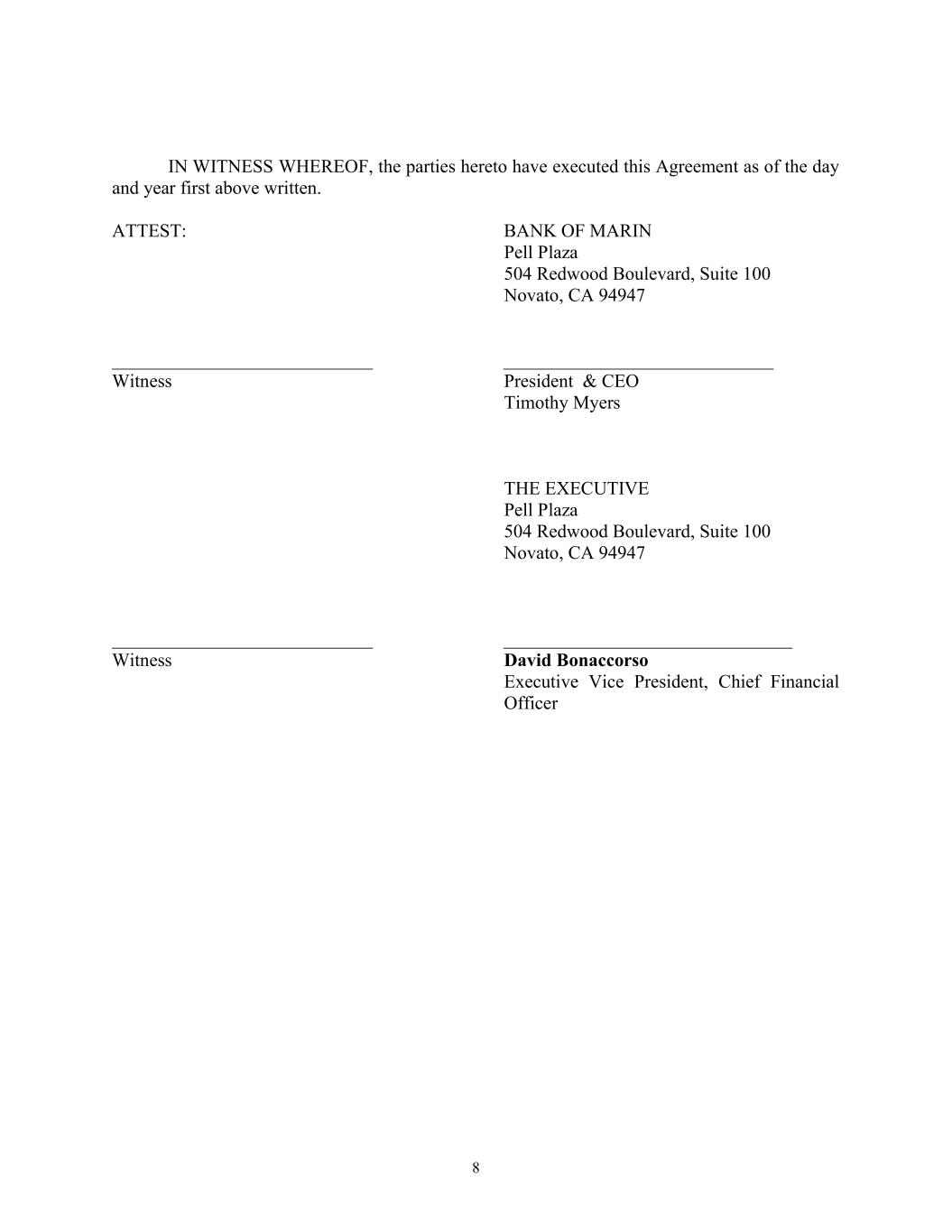 8 IN WITNESS WHEREOF, the parties hereto have executed this Agreement as of the day and year first above written. ATTEST: BANK OF MARIN Pell Plaza 504 Redwood Boulevard, Suite 100 Novato, CA 94947 ____________________________ _____________________________ Witness President & CEO Timothy Myers THE EXECUTIVE Pell Plaza 504 Redwood Boulevard, Suite 100 Novato, CA 94947 ____________________________ _______________________________ Witness David Bonaccorso Executive Vice President, Chief Financial Officer