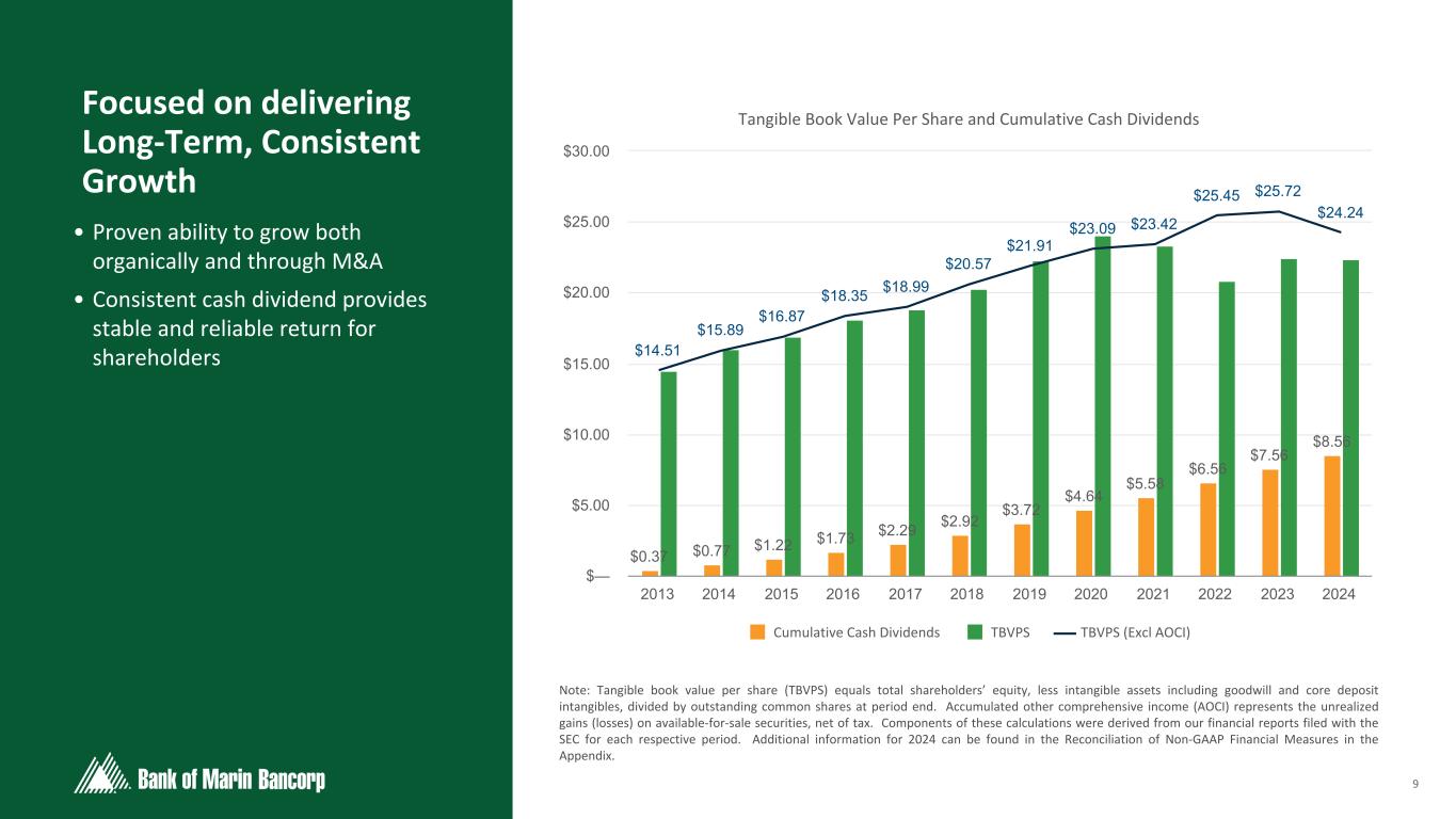 8 Text 95,96,96 Light Gray 232, 232, 232 Black 0, 0, 0 White 255, 255, 255 Accent 1 7,89,52 Accent 2 248,153,40 Accent 3 254,217,129 Accent 4 52,153,70 Accent 5 5,39,67 Accent 6 171,184,195 Focused on Building Long-Term Shareholder Value Strong Core Deposit Franchise Largest community bank in Marin County with 12.0% market share 1 44% non-interest bearing deposits with a 1.36% cost of deposits in 4Q24 Improving Margin Outlook Improving asset yield due to: • weighted average rates on loan originations exceed payoff rates • Reduction in funding costs continue in Q4 Seasoned Risk Management Classified loans reduced by 14% in Q4 Low NOO CRE office exposure in the City of San Francisco at 3% of total loans (5% of total NOO-CRE) and a weighted average 65% LTV Prudent Loan Growth Markets with proven track record of organic growth Organic originations increased by 67% in Q4 Key opportunistic relationship banking talent acquisitions due to market dislocation 65% loan-to-deposit ratio provides runway for additional growth Robust Capital Levels & Liquidity Regulatory capital ratios remain comfortably above “well-capitalized” thresholds $1.8 billion in available liquidity 1Source: S&P Global Market Intelligence - FDIC deposit market share data as of June 30, 2024