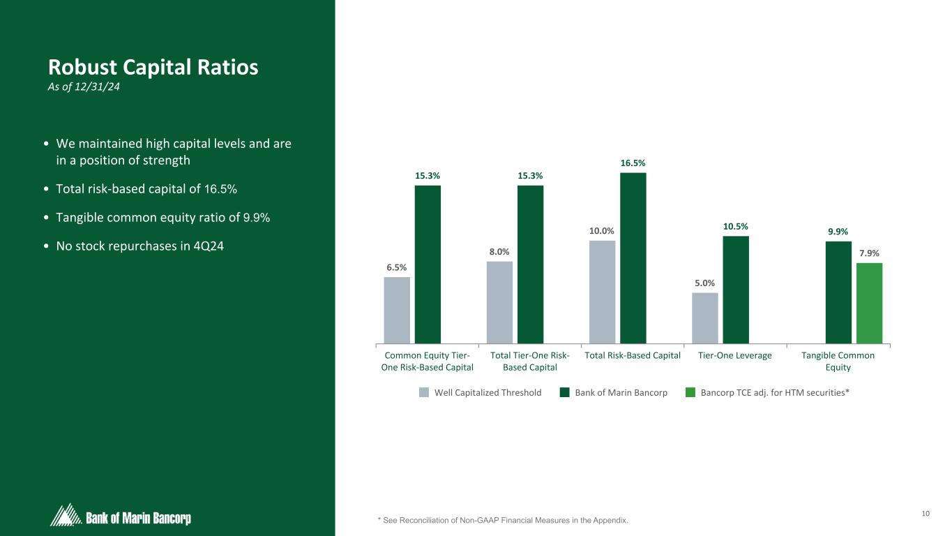9 Text 95,96,96 Light Gray 232, 232, 232 Black 0, 0, 0 White 255, 255, 255 Accent 1 7,89,52 Accent 2 248,153,40 Accent 3 254,217,129 Accent 4 52,153,70 Accent 5 5,39,67 Accent 6 171,184,195 Focused on delivering Long-Term, Consistent Growth • Proven ability to grow both organically and through M&A • Consistent cash dividend provides stable and reliable return for shareholders Note: Tangible book value per share (TBVPS) equals total shareholders’ equity, less intangible assets including goodwill and core deposit intangibles, divided by outstanding common shares at period end. Accumulated other comprehensive income (AOCI) represents the unrealized gains (losses) on available-for-sale securities, net of tax. Components of these calculations were derived from our financial reports filed with the SEC for each respective period. Additional information for 2024 can be found in the Reconciliation of Non-GAAP Financial Measures in the Appendix. Tangible Book Value Per Share and Cumulative Cash Dividends $0.37 $0.77 $1.22 $1.73 $2.29 $2.92 $3.72 $4.64 $5.58 $6.56 $7.56 $8.56 $14.51 $15.89 $16.87 $18.35 $18.99 $20.57 $21.91 $23.09 $23.42 $25.45 $25.72 $24.24 Cumulative Cash Dividends TBVPS TBVPS (Excl AOCI) 2013 2014 2015 2016 2017 2018 2019 2020 2021 2022 2023 2024 $— $5.00 $10.00 $15.00 $20.00 $25.00 $30.00