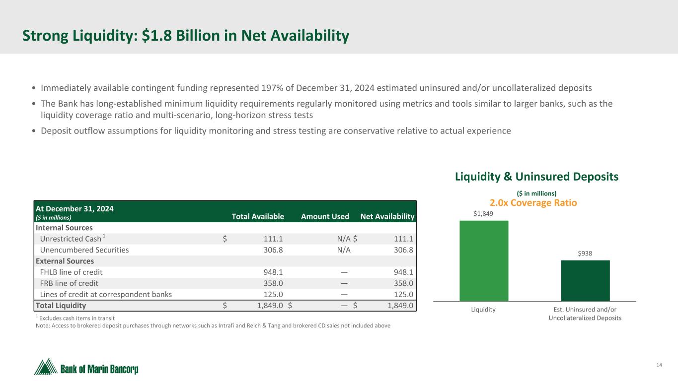 13 Text 95,96,96 Light Gray 232, 232, 232 Black 0, 0, 0 White 255, 255, 255 Accent 1 7,89,52 Accent 2 248,153,40 Accent 3 254,217,129 Accent 4 52,153,70 Accent 5 5,39,67 Accent 6 171,184,195 • 43% of new accounts consisted of new relationships to the Bank • 63% of new accounts were non-interest bearing by count • 70% of new accounts were interest- bearing in dollars at a weighted average rate of 2.28% • Reciprocal deposit network program (expanded FDIC insurance products) utilization decreased notionally by $37.2 million New Accounts Mix (by count) 4Q24Granular Deposit Account Composition Existing Relationships - New $ 18% Account Migration 39% New Relationships 43% 1,045 (in thousands; except for # of Accounts) Interest Bearing Non-Interest Bearing Total Consumer Account Balances $ 971,823 $ 330,178 $ 1,302,001 # of Accounts 15,128 17,511 32,639 Avg Balance Per Account $ 64 $ 19 $ 40 Business Account Balances $ 847,302 $ 1,063,373 $ 1,910,675 # of Accounts 3,710 11,342 15,052 Avg Balance Per Account $ 228 $ 94 $ 127 *Excludes internal operating accounts such as holding company cash and deposit settlement accounts totaling $1.3 million Deposit Accounts Mix - Consumer vs Business 4Q24