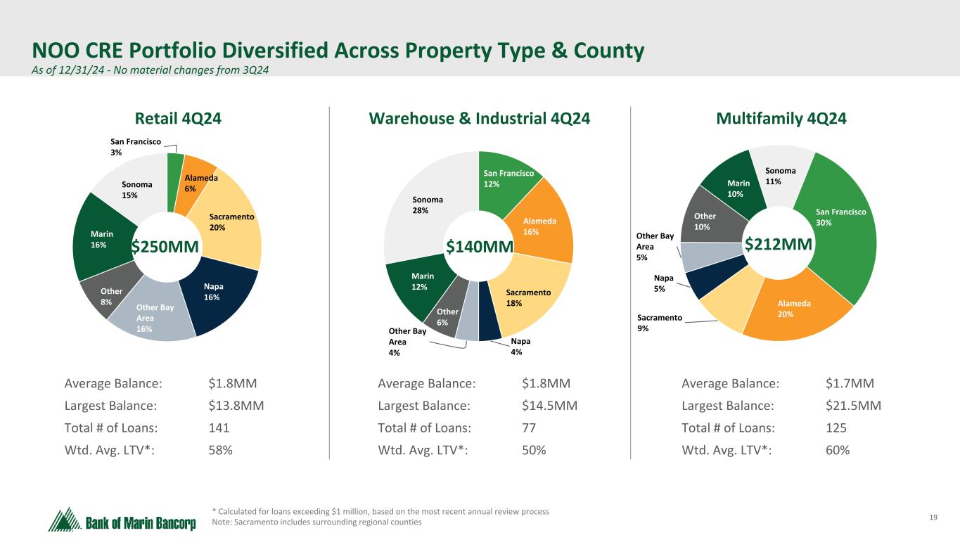 18 Text 95,96,96 Light Gray 232, 232, 232 Black 0, 0, 0 White 255, 255, 255 Accent 1 7,89,52 Accent 2 248,153,40 Accent 3 254,217,129 Accent 4 52,153,70 Accent 5 5,39,67 Accent 6 171,184,195 • $350 million in credit exposure spread across our lending footprint comprised of 144 loans • $2.4 million average loan balance – largest loan at $16.1 million • 59% weighted average loan-to-value and 1.68x weighted average debt-service coverage ratio* • City of San Francisco NOO CRE office exposure is 3% of total loan portfolio and 5% of total NOO CRE loans NOO CRE Office Portfolio by County * Calculated for loans exceeding $1 million, based on the most recent annual review process, and net of individual reserves Non-owner Occupied Office Exposure As of 12/31/24 - No material changes from 3Q24 San Francisco 18% Alameda 6% Sacramento 6% Napa 9% Other Bay Area 15%Other 4% Marin 25% Sonoma 17% $350MM City of S.F. NOO CRE Office Portfolio Total Balance: $62.5 million Average Loan Bal: $4.8 million Number of Loans: 13 loans Wtd. Average LTV*: 65% Wtd. Average DCR: 1.40x Average Occupancy: 85% 12 of the 13 loans are secured by low rise buildings and one loan is secured by a 10 story building