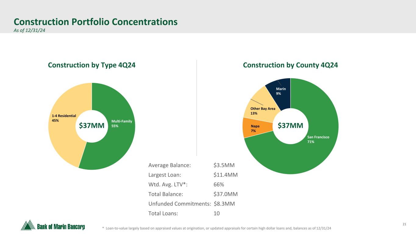 20 Text 95,96,96 Light Gray 232, 232, 232 Black 0, 0, 0 White 255, 255, 255 Accent 1 7,89,52 Accent 2 248,153,40 Accent 3 254,217,129 Accent 4 52,153,70 Accent 5 5,39,67 Accent 6 171,184,195 ($ in millions at Fair Value) * Loan-to-value largely based on appraised values at origination, or updated appraisals for certain classified loans, and balances as of 12/31/24 Owner-Occupied CRE Portfolio As of 12/31/24 - No material changes from 3Q24 Retail 7% School 15% Wine 10% Church 6% Gas/Auto 8% Health Club 4% Mixed Use 2% Other 6% Office 19% Industrial 23% Napa 16% Sacramento 19% San Francisco 5% Sonoma 9% Other 17% Alameda 14% Marin 20% OO CRE by County 4Q24 Average Balance: $1.1MM Largest Loan: $15.0MM Wtd. Avg. LTV*: 46% Total Balance: $322.0MM Total Loans: 292 OO CRE by Type 4Q24 $322MM $322MM Napa 21% Sacramento 19% San Francisco 18% Sonoma 8% Other 6% Alameda 6% Marin 22% Average Balance: $0.7MM Largest Loan: $7.2MM Wtd. Avg. LTV*: 56% Total Balance: $62.8MM Total Loans: 93 OO CRE Office Portfolio by County 4Q24 $63MM