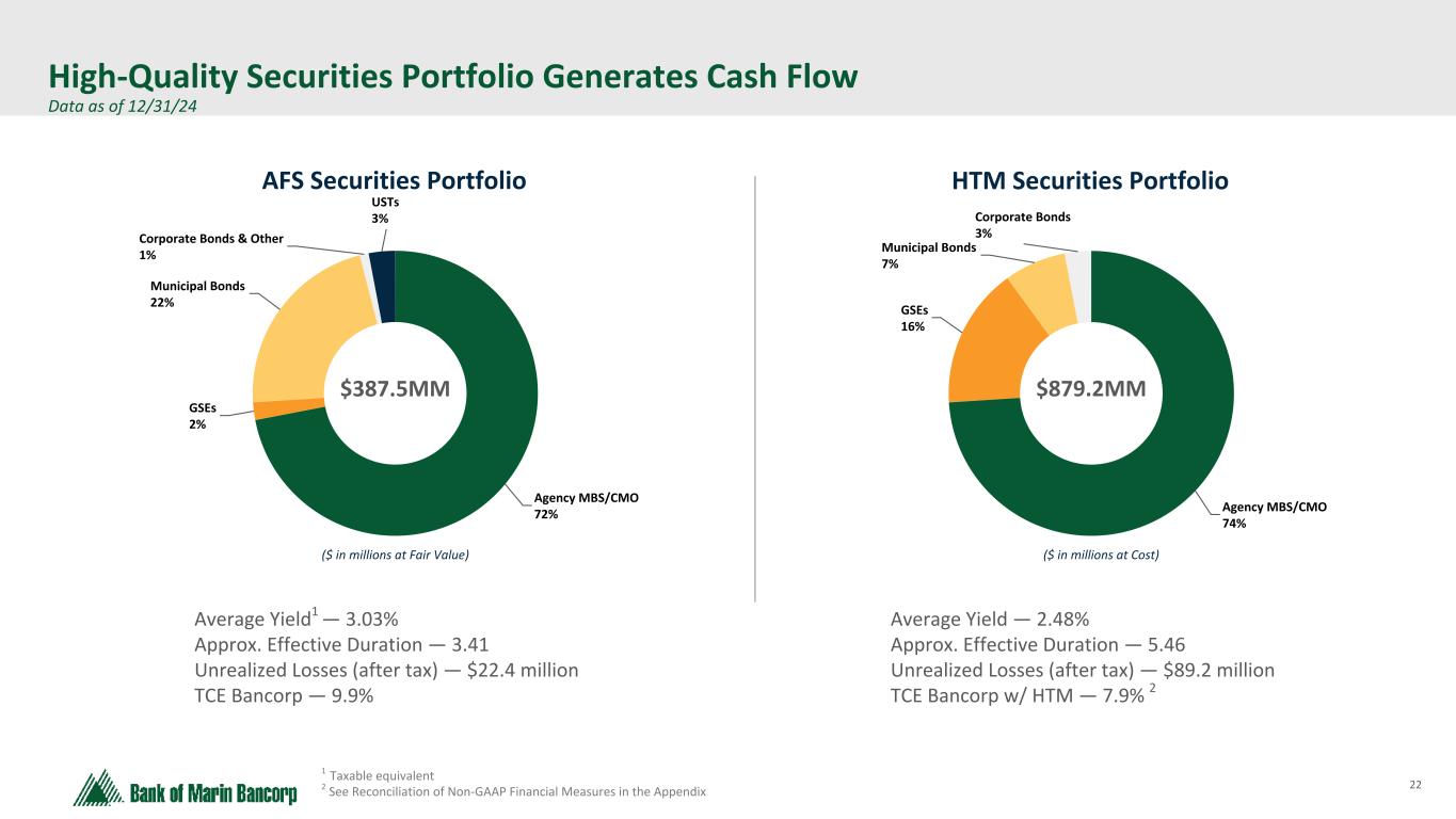 31 Text 95,96,96 Light Gray 232, 232, 232 Black 0, 0, 0 White 255, 255, 255 Accent 1 7,89,52 Accent 2 248,153,40 Accent 3 254,217,129 Accent 4 52,153,70 Accent 5 5,39,67 Accent 6 171,184,195 Reconciliation of GAAP to Non-GAAP Financial Measures (in thousands, except per share amounts; unaudited) December 31, 2024 Tangible Common Equity - Bancorp Total stockholders' equity $ 435,407 Goodwill and core deposit intangible (75,546) Total TCE a 359,861 Unrealized losses on HTM securities, net of tax 1 (89,171) Unrealized losses on HTM securities included in AOCI, net of tax 2 7,701 TCE, net of unrealized losses on HTM securities (non-GAAP) b $ 278,391 Total assets $ 3,701,335 Goodwill and core deposit intangible (75,546) Total tangible assets c 3,625,789 Unrealized losses on HTM securities, net of tax 1 (89,171) Unrealized losses on HTM securities included in AOCI, net of tax 2 7,701 Total tangible assets, net of unrealized losses on HTM securities (non-GAAP) d $ 3,544,319 Bancorp TCE ratio a / c 9.9 % Bancorp TCE ratio, net of unrealized losses on HTM securities (non-GAAP) b / d 7.9 % Tangible Book Value Per Share Common shares outstanding e 16,089 Book value per share $ 27.06 Tangible book value per share a / e $ 22.37 For further discussion about these non-GAAP financial measures, refer to our Form 8-K under Item 9 - Financial Statements and Exhibit 99.1 filed with the SEC on January 27, 2025. 1 Unrealized losses on held-to-maturity securities as of December 31, 2024 of $126.6 million, including the unrealized losses that resulted from the transfer of securities from AFS to HTM, net of an estimated $37.4 million in deferred tax benefits based on a blended state and federal statutory tax rate of 29.56%. 2 The remaining unrealized losses that resulted from the transfer of securities from AFS to HTM, net of an estimated $3.2 million in deferred tax benefits based on a blended state and federal statutory tax rate of 29.56% are added back as they are already included in AOCI.