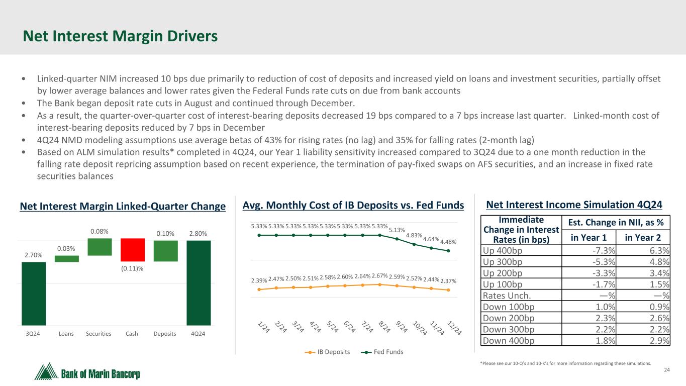 24 Text 95,96,96 Light Gray 232, 232, 232 Black 0, 0, 0 White 255, 255, 255 Accent 1 7,89,52 Accent 2 248,153,40 Accent 3 254,217,129 Accent 4 52,153,70 Accent 5 5,39,67 Accent 6 171,184,195 • Linked-quarter NIM increased 10 bps due primarily to reduction of cost of deposits and increased yield on loans and investment securities, partially offset by lower average balances and lower rates given the Federal Funds rate cuts on due from bank accounts • The Bank began deposit rate cuts in August and continued through December. • As a result, the quarter-over-quarter cost of interest-bearing deposits decreased 19 bps compared to a 7 bps increase last quarter. Linked-month cost of interest-bearing deposits reduced by 7 bps in December • 4Q24 NMD modeling assumptions use average betas of 43% for rising rates (no lag) and 35% for falling rates (2-month lag) • Based on ALM simulation results* completed in 4Q24, our Year 1 liability sensitivity increased compared to 3Q24 due to a one month reduction in the falling rate deposit repricing assumption based on recent experience, the termination of pay-fixed swaps on AFS securities, and an increase in fixed rate securities balances Net Interest Margin Drivers 2.70% 0.03% 0.08% (0.11)% 0.10% 2.80% 3Q24 Loans Securities Cash Deposits 4Q24 Net Interest Margin Linked-Quarter Change 2.39% 2.47% 2.50% 2.51% 2.58% 2.60% 2.64% 2.67% 2.59% 2.52% 2.44% 2.37% 5.33% 5.33% 5.33% 5.33% 5.33% 5.33% 5.33% 5.33% 5.13% 4.83% 4.64% 4.48% IB Deposits Fed Funds 1/24 2/24 3/24 4/24 5/24 6/24 7/24 8/24 9/24 10/24 11/24 12/24 Avg. Monthly Cost of IB Deposits vs. Fed Funds Immediate Change in Interest Rates (in bps) Est. Change in NII, as % in Year 1 in Year 2 Up 400bp -7.3 % 6.3 % Up 300bp -5.3 % 4.8 % Up 200bp -3.3 % 3.4 % Up 100bp -1.7 % 1.5 % Rates Unch. — % — % Down 100bp 1.0 % 0.9 % Down 200bp 2.3 % 2.6 % Down 300bp 2.2 % 2.2 % Down 400bp 1.8 % 2.9 % *Please see our 10-Q’s and 10-K’s for more information regarding these simulations. Net Interest Income Simulation 4Q24