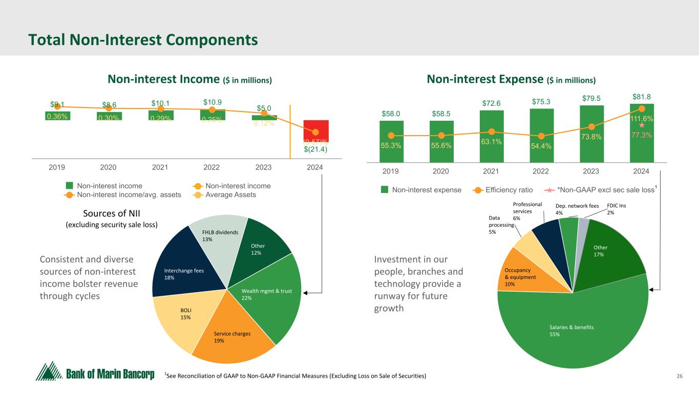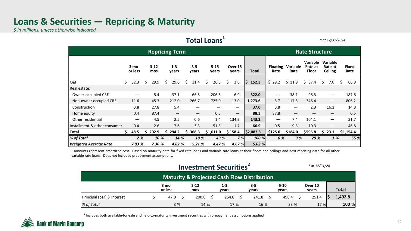 25 Text 95,96,96 Light Gray 232, 232, 232 Black 0, 0, 0 White 255, 255, 255 Accent 1 7,89,52 Accent 2 248,153,40 Accent 3 254,217,129 Accent 4 52,153,70 Accent 5 5,39,67 Accent 6 171,184,195 Loans & Securities — Repricing & Maturity $ in millions, unless otherwise indicated Total Loans1 * at 12/31/2024 Repricing Term Rate Structure 3 mo or less 3-12 mos 1-3 years 3-5 years 5-15 years Over 15 years Total Floating Rate Variable Rate Variable Rate at Floor Variable Rate at Ceiling Fixed Rate C&I $ 32.3 $ 29.9 $ 29.6 $ 31.4 $ 26.5 $ 2.6 $ 152.3 $ 29.2 $ 11.9 $ 37.4 $ 7.0 $ 66.8 Real estate: Owner-occupied CRE — 5.4 37.1 66.3 206.3 6.9 322.0 — 38.1 96.3 — 187.6 Non-owner occupied CRE 11.6 45.3 212.0 266.7 725.0 13.0 1,273.6 3.7 117.3 346.4 — 806.2 Construction 3.8 27.8 5.4 — — — 37.0 3.8 — 2.3 16.1 14.8 Home equity 0.4 87.4 — — 0.5 — 88.3 87.8 — — — 0.5 Other residential — 4.5 2.5 0.6 1.4 134.2 143.2 — 7.4 104.1 — 31.7 Installment & other consumer 0.4 2.6 7.6 3.3 51.3 1.7 66.9 0.5 9.3 10.3 — 46.8 Total $ 48.5 $ 202.9 $ 294.2 $ 368.3 $ 1,011.0 $ 158.4 $ 2,083.3 $ 125.0 $ 184.0 $ 596.8 $ 23.1 $ 1,154.4 % of Total 2 % 10 % 14 % 18 % 49 % 7 % 100 % 6 % 9 % 29 % 1 % 55 % Weighted Average Rate 7.93 % 7.30 % 4.82 % 5.21 % 4.47 % 4.67 % 5.02 % 1 Amounts represent amortized cost. Based on maturity date for fixed rate loans and variable rate loans at their floors and ceilings and next repricing date for all other variable rate loans. Does not included prepayment assumptions. Investment Securities2 * at 12/31/24 2 Includes both available-for-sale and held-to-maturity investment securities with prepayment assumptions applied Maturity & Projected Cash Flow Distribution 3 mo or less 3-12 mos 1-3 years 3-5 years 5-10 years Over 10 years Total Principal (par) & interest $ 47.8 $ 200.6 $ 254.8 $ 241.8 $ 496.4 $ 251.4 $ 1,492.8 % of Total 3 % 14 % 17 % 16 % 33 % 17 % 100 %