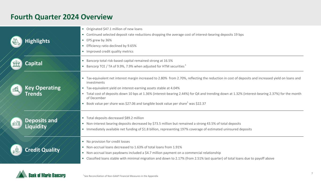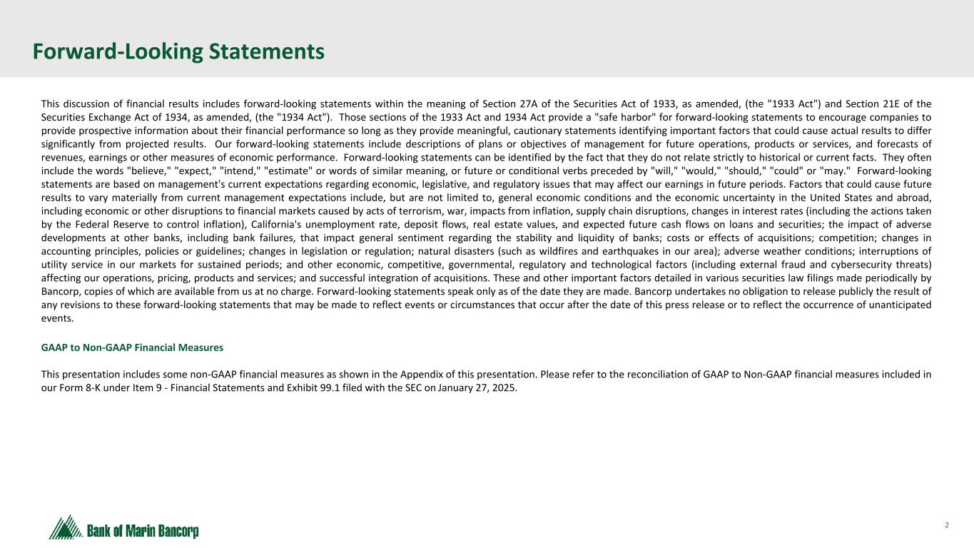 2 Text 95,96,96 Light Gray 232, 232, 232 Black 0, 0, 0 White 255, 255, 255 Accent 1 7,89,52 Accent 2 248,153,40 Accent 3 254,217,129 Accent 4 52,153,70 Accent 5 5,39,67 Accent 6 171,184,195 Forward-Looking Statements This discussion of financial results includes forward-looking statements within the meaning of Section 27A of the Securities Act of 1933, as amended, (the "1933 Act") and Section 21E of the Securities Exchange Act of 1934, as amended, (the "1934 Act"). Those sections of the 1933 Act and 1934 Act provide a "safe harbor" for forward-looking statements to encourage companies to provide prospective information about their financial performance so long as they provide meaningful, cautionary statements identifying important factors that could cause actual results to differ significantly from projected results. Our forward-looking statements include descriptions of plans or objectives of management for future operations, products or services, and forecasts of revenues, earnings or other measures of economic performance. Forward-looking statements can be identified by the fact that they do not relate strictly to historical or current facts. They often include the words "believe," "expect," "intend," "estimate" or words of similar meaning, or future or conditional verbs preceded by "will," "would," "should," "could" or "may." Forward-looking statements are based on management's current expectations regarding economic, legislative, and regulatory issues that may affect our earnings in future periods. Factors that could cause future results to vary materially from current management expectations include, but are not limited to, general economic conditions and the economic uncertainty in the United States and abroad, including economic or other disruptions to financial markets caused by acts of terrorism, war, impacts from inflation, supply chain disruptions, changes in interest rates (including the actions taken by the Federal Reserve to control inflation), California's unemployment rate, deposit flows, real estate values, and expected future cash flows on loans and securities; the impact of adverse developments at other banks, including bank failures, that impact general sentiment regarding the stability and liquidity of banks; costs or effects of acquisitions; competition; changes in accounting principles, policies or guidelines; changes in legislation or regulation; natural disasters (such as wildfires and earthquakes in our area); adverse weather conditions; interruptions of utility service in our markets for sustained periods; and other economic, competitive, governmental, regulatory and technological factors (including external fraud and cybersecurity threats) affecting our operations, pricing, products and services; and successful integration of acquisitions. These and other important factors detailed in various securities law filings made periodically by Bancorp, copies of which are available from us at no charge. Forward-looking statements speak only as of the date they are made. Bancorp undertakes no obligation to release publicly the result of any revisions to these forward-looking statements that may be made to reflect events or circumstances that occur after the date of this press release or to reflect the occurrence of unanticipated events. GAAP to Non-GAAP Financial Measures This presentation includes some non-GAAP financial measures as shown in the Appendix of this presentation. Please refer to the reconciliation of GAAP to Non-GAAP financial measures included in our Form 8-K under Item 9 - Financial Statements and Exhibit 99.1 filed with the SEC on January 27, 2025.