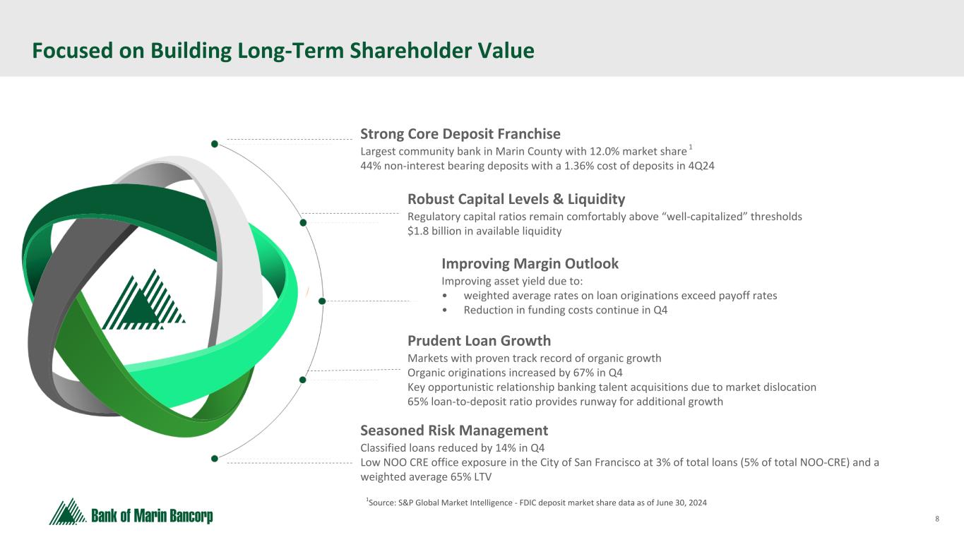 7 Text 95,96,96 Light Gray 232, 232, 232 Black 0, 0, 0 White 255, 255, 255 Accent 1 7,89,52 Accent 2 248,153,40 Accent 3 254,217,129 Accent 4 52,153,70 Accent 5 5,39,67 Accent 6 171,184,195 Fourth Quarter 2024 Overview 1 See Reconciliation of Non-GAAP Financial Measures in the Appendix Highlights • Originated $47.1 million of new loans • Continued selected deposit rate reductions dropping the average cost of interest-bearing deposits 19 bps • EPS grew by 36% • Efficiency ratio declined by 9.65% • Improved credit quality metrics Capital • Bancorp total risk-based capital remained strong at 16.5% • Bancorp TCE / TA of 9.9%, 7.9% when adjusted for HTM securities 1 Key Operating Trends • Tax-equivalent net interest margin increased to 2.80% from 2.70%, reflecting the reduction in cost of deposits and increased yield on loans and investments • Tax-equivalent yield on interest-earning assets stable at 4.04% • Total cost of deposits down 10 bps at 1.36% (interest-bearing 2.44%) for Q4 and trending down at 1.32% (interest-bearing 2.37%) for the month of December • Book value per share was $27.06 and tangible book value per share1 was $22.37 Deposits and Liquidity • Total deposits decreased $89.2 million • Non-interest bearing deposits decreased by $73.5 million but remained a strong 43.5% of total deposits • Immediately available net funding of $1.8 billion, representing 197% coverage of estimated uninsured deposits Credit Quality • No provision for credit losses • Non-accrual loans decreased to 1.63% of total loans from 1.91% • Non-accrual loan paydowns included a $4.7 million payment on a commercial relationship • Classified loans stable with minimal migration and down to 2.17% (from 2.51% last quarter) of total loans due to payoff above