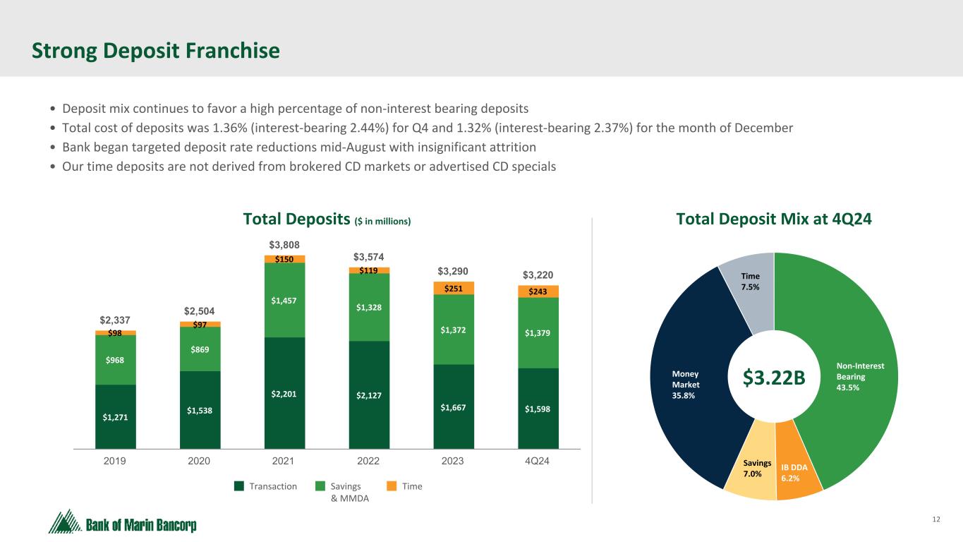 12 Text 95,96,96 Light Gray 232, 232, 232 Black 0, 0, 0 White 255, 255, 255 Accent 1 7,89,52 Accent 2 248,153,40 Accent 3 254,217,129 Accent 4 52,153,70 Accent 5 5,39,67 Accent 6 171,184,195 Strong Deposit Franchise • Deposit mix continues to favor a high percentage of non-interest bearing deposits • Total cost of deposits was 1.36% (interest-bearing 2.44%) for Q4 and 1.32% (interest-bearing 2.37%) for the month of December • Bank began targeted deposit rate reductions mid-August with insignificant attrition • Our time deposits are not derived from brokered CD markets or advertised CD specials Total Deposit Mix at 4Q24Total Deposits ($ in millions) $2,337 $2,504 $3,808 $3,574 $3,290 $3,220 $1,271 $1,538 $2,201 $2,127 $1,667 $1,598 $968 $869 $1,457 $1,328 $1,372 $1,379$98 $97 $150 $119 $251 $243 Transaction Savings & MMDA Time 2019 2020 2021 2022 2023 4Q24 Non-Interest Bearing 43.5% IB DDA 6.2% Savings 7.0% Money Market 35.8% Time 7.5% $3.22B