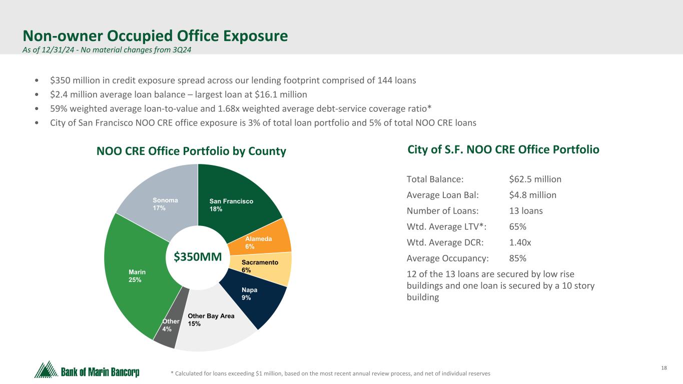 17 Text 95,96,96 Light Gray 232, 232, 232 Black 0, 0, 0 White 255, 255, 255 Accent 1 7,89,52 Accent 2 248,153,40 Accent 3 254,217,129 Accent 4 52,153,70 Accent 5 5,39,67 Accent 6 171,184,195 Low Refinance Risk in NOO CRE Portfolio through 2026 • We conducted a DEEP DIVE on loans maturing or repricing before year-end 2026 * • PORTFOLIO IS WELL-POSITIONED TO ABSORB HIGHER RATE ENVIRONMENT AT MATURITY OR REPRICING DATE • Wtd. Avg. DSC Assumptions for Maturing Loans: Current market interest rate + spread of 3.00%, fully drawn commercial real estate lines of credit, 25-year amortization • Wtd. Avg. DSC Assumptions for Repricing Loans: Current market interest rate + contractual spread, fully drawn commercial real estate lines of credit, remaining amortization on each loan Maturing Loan Commitments > $1.0MM # of loans Commitment Outstanding Balance Wtd. Avg. Rate Wtd. Avg. DSC 2025 27 $91.7MM $86.5MM 4.99% 1.21x 2026 25 $93.8MM $86.8MM 4.60% 1.14x1 TOTAL 52 $185.5MM $173.3MM Repricing Loan Commitments > $1.0MM # of loans Commitment Outstanding Balance Wtd. Avg. Rate Wtd. Avg. DSC 2025 18 $35.6MM $35.6MM 4.58% 1.50x 2026 25 $59.2MM $59.2MM 3.91% 1.40x TOTAL 43 $94.8MM $94.8MM 1Net of reserves, weighted average debt service coverage is 1.23x *Commitments, outstanding balances and weighted average rates as of 12/31/24