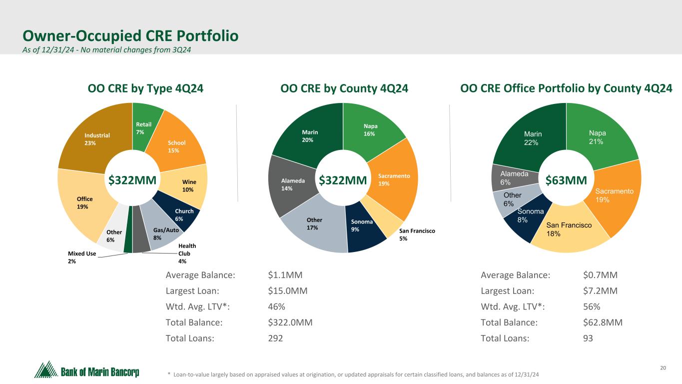 19 Text 95,96,96 Light Gray 232, 232, 232 Black 0, 0, 0 White 255, 255, 255 Accent 1 7,89,52 Accent 2 248,153,40 Accent 3 254,217,129 Accent 4 52,153,70 Accent 5 5,39,67 Accent 6 171,184,195 * Calculated for loans exceeding $1 million, based on the most recent annual review process Note: Sacramento includes surrounding regional counties NOO CRE Portfolio Diversified Across Property Type & County As of 12/31/24 - No material changes from 3Q24 Average Balance: $1.8MM Largest Balance: $13.8MM Total # of Loans: 141 Wtd. Avg. LTV*: 58% Average Balance: $1.8MM Largest Balance: $14.5MM Total # of Loans: 77 Wtd. Avg. LTV*: 50% Average Balance: $1.7MM Largest Balance: $21.5MM Total # of Loans: 125 Wtd. Avg. LTV*: 60% San Francisco 3% Alameda 6% Sacramento 20% Napa 16% Other Bay Area 16% Other 8% Marin 16% Sonoma 15% San Francisco 12% Alameda 16% Sacramento 18% Napa 4% Other Bay Area 4% Other 6% Marin 12% Sonoma 28% San Francisco 30% Alameda 20%Sacramento 9% Napa 5% Other Bay Area 5% Other 10% Marin 10% Sonoma 11% Retail 4Q24 Warehouse & Industrial 4Q24 Multifamily 4Q24 $250MM $140MM $212MM