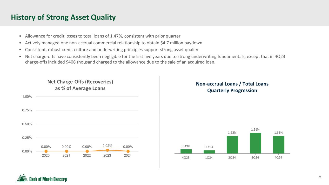 24 Text 95,96,96 Light Gray 232, 232, 232 Black 0, 0, 0 White 255, 255, 255 Accent 1 7,89,52 Accent 2 248,153,40 Accent 3 254,217,129 Accent 4 52,153,70 Accent 5 5,39,67 Accent 6 171,184,195 • Linked-quarter NIM increased 10 bps due primarily to reduction of cost of deposits and increased yield on loans and investment securities, partially offset by lower average balances and lower rates given the Federal Funds rate cuts on due from bank accounts • The Bank began deposit rate cuts in August and continued through December. • As a result, the quarter-over-quarter cost of interest-bearing deposits decreased 19 bps compared to a 7 bps increase last quarter. Linked-month cost of interest-bearing deposits reduced by 7 bps in December • 4Q24 NMD modeling assumptions use average betas of 43% for rising rates (no lag) and 35% for falling rates (2-month lag) • Based on ALM simulation results* completed in 4Q24, our Year 1 liability sensitivity increased compared to 3Q24 due to a one month reduction in the falling rate deposit repricing assumption based on recent experience, the termination of pay-fixed swaps on AFS securities, and an increase in fixed rate securities balances Net Interest Margin Drivers 2.70% 0.03% 0.08% (0.11)% 0.10% 2.80% 3Q24 Loans Securities Cash Deposits 4Q24 Net Interest Margin Linked-Quarter Change 2.39% 2.47% 2.50% 2.51% 2.58% 2.60% 2.64% 2.67% 2.59% 2.52% 2.44% 2.37% 5.33% 5.33% 5.33% 5.33% 5.33% 5.33% 5.33% 5.33% 5.13% 4.83% 4.64% 4.48% IB Deposits Fed Funds 1/24 2/24 3/24 4/24 5/24 6/24 7/24 8/24 9/24 10/24 11/24 12/24 Avg. Monthly Cost of IB Deposits vs. Fed Funds Immediate Change in Interest Rates (in bps) Est. Change in NII, as % in Year 1 in Year 2 Up 400bp -7.3 % 6.3 % Up 300bp -5.3 % 4.8 % Up 200bp -3.3 % 3.4 % Up 100bp -1.7 % 1.5 % Rates Unch. — % — % Down 100bp 1.0 % 0.9 % Down 200bp 2.3 % 2.6 % Down 300bp 2.2 % 2.2 % Down 400bp 1.8 % 2.9 % *Please see our 10-Q’s and 10-K’s for more information regarding these simulations. Net Interest Income Simulation 4Q24